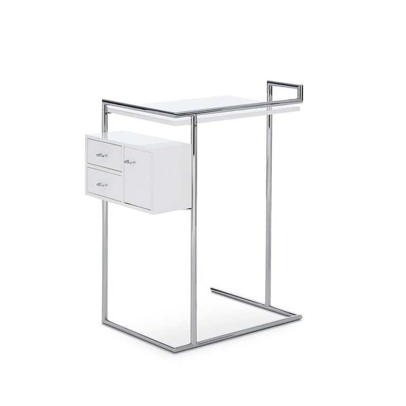 Eileen Gray, figure marquante du design du XXéme siècle, allie l?esthétique et la fonctionnalité avec sa table à maquillage Petite Coiffeuse, conçue pour la maison E 1027. Classicon édite cette petite table d'appoint originale et élégante composée d'éléments géométriques, posés sur une structure en tube d'acier chromé associée à un plateau et des rangements en MDF laqué blanc ou noir. L?ensemble se limite à l?essentiel pour en faciliter son utilisation au quotidien : chaque élément se trouve à portée de main avec le petit placard latéral dont les deux tiroirs son pivotants. Un meuble de décoration aussi pratique que sophistiqué pour une chambre de fille, et parfait pour les petits espaces.