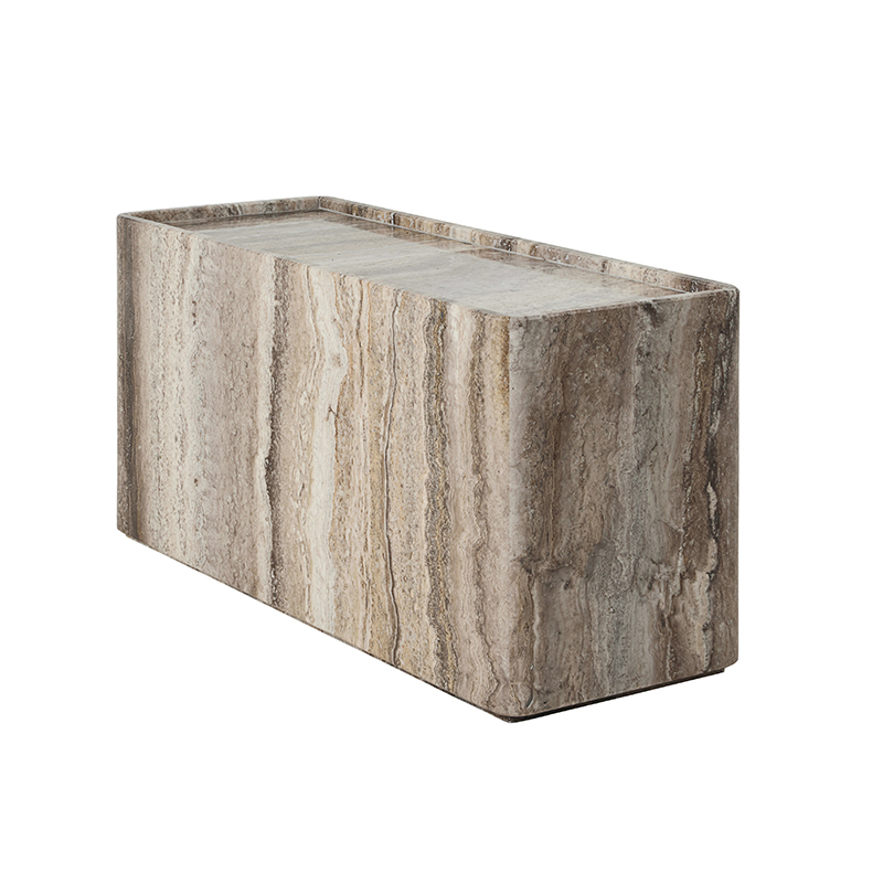 Avec Pietra, le duo GamFratesi poursuit l'exploration matérielle du travertin avec les tables Epic et Doric pour Gubi. Les tables d'appoint Pietra célèbrent les motifs fascinants de la surface de la pierre. Disponible en deux tailles et deux couleurs, chaque table Pietra est fabriquée à la main à partir de six pièces. Le résultat est une pièce qui semble avoir été sculptée dans un seul bloc de pierre. Un rebord surélevé autour du bord légèrement incurvé du plateau de la table crée une surface utile semblable à un plateau, idéale pour exposer des objets ou poser un verre en toute sécurité. Soigneusement taillés, ajustés et finis, les bords et les coins incurvés de la table Pietra montrent un extraordinaire niveau de savoir-faire artisanal et apporte à la pierre une impression de douceur.
