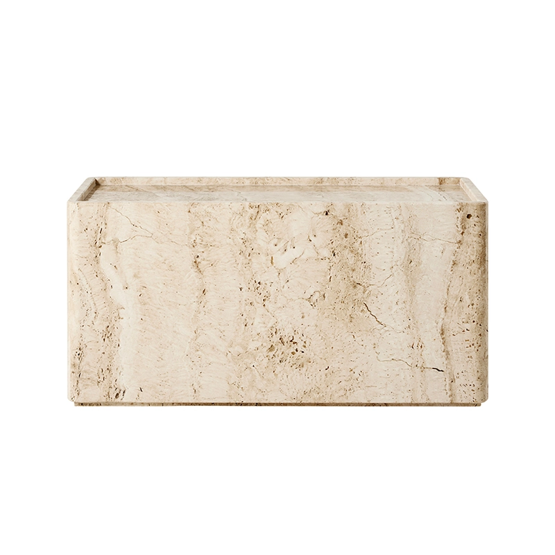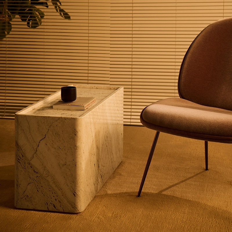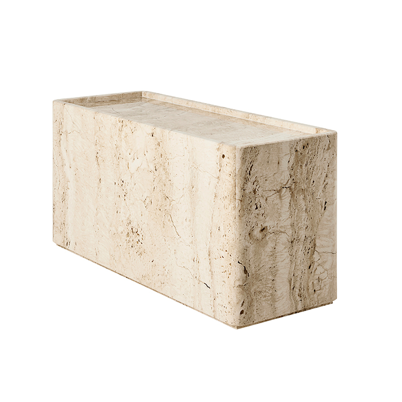 Avec Pietra, le duo GamFratesi poursuit l'exploration matérielle du travertin avec les tables Epic et Doric pour Gubi. Les tables d'appoint Pietra célèbrent les motifs fascinants de la surface de la pierre. Disponible en deux tailles et deux couleurs, chaque table Pietra est fabriquée à la main à partir de six pièces. Le résultat est une pièce qui semble avoir été sculptée dans un seul bloc de pierre. Un rebord surélevé autour du bord légèrement incurvé du plateau de la table crée une surface utile semblable à un plateau, idéale pour exposer des objets ou poser un verre en toute sécurité. Soigneusement taillés, ajustés et finis, les bords et les coins incurvés de la table Pietra montrent un extraordinaire niveau de savoir-faire artisanal et apporte à la pierre une impression de douceur.