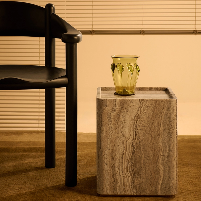 Avec Pietra, le duo GamFratesi poursuit l'exploration matérielle du travertin avec les tables Epic et Doric pour Gubi. Les tables d'appoint Pietra célèbrent les motifs fascinants de la surface de la pierre. Disponible en deux tailles et deux couleurs, chaque table Pietra est fabriquée à la main à partir de six pièces. Le résultat est une pièce qui semble avoir été sculptée dans un seul bloc de pierre. Un rebord surélevé autour du bord légèrement incurvé du plateau de la table crée une surface utile semblable à un plateau, idéale pour exposer des objets ou poser un verre en toute sécurité. Soigneusement taillés, ajustés et finis, les bords et les coins incurvés de la table Pietra montrent un extraordinaire niveau de savoir-faire artisanal et apporte à la pierre une impression de douceur.