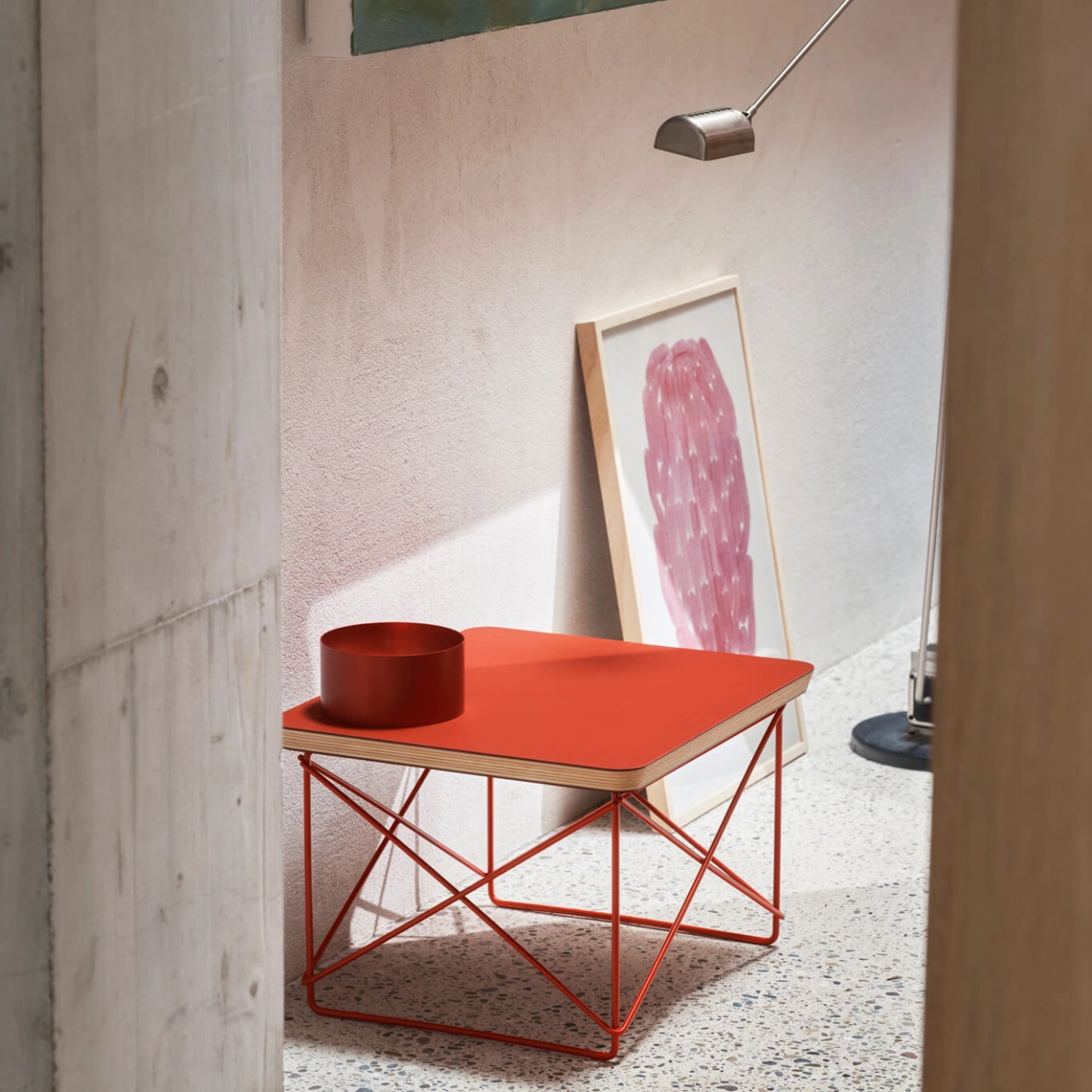 Contreplaqué de peuplier, chant laqué, stratifié en linoléum coloré, piètement en fil d‘acier finition époxy eames classic red