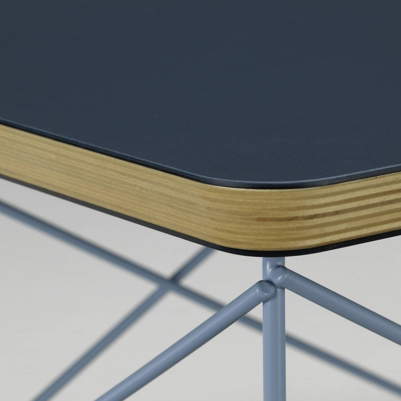 Contreplaqué de peuplier, chant laqué, stratifié en linoléum coloré, piètement en fil d‘acier finition époxy bleu ciel