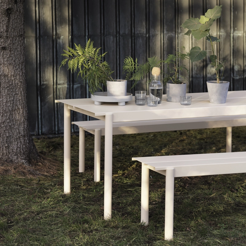 Première collection outdoor de Muuto, Linear est une collection de meubles pour l’extérieur fonctionnels et durables, à l’expression raffinée. La collection consiste en une table et un banc, disponibles en deux tailles et plusieurs coloris, caractérisés par leur allure légère presque aérienne. Avec ses lignes claires et son look à la fois intemporel et contemporain, Linear apporte de nouvelles perspectives au mobilier d’extérieur tout en améliorant son environnement. Conçue par le designer Thomas Bentzen, la série est dotée de détails subtils comme la section des pieds qui se transforme en demi-cercle, les bords courbés et les rainures pour faciliter l’évacuation de l’eau. Editée par Muuto, cette collection apporte une solution aussi fonctionnelle qu’esthétique à tout jardin, terrasse, café ou lieu de travail.