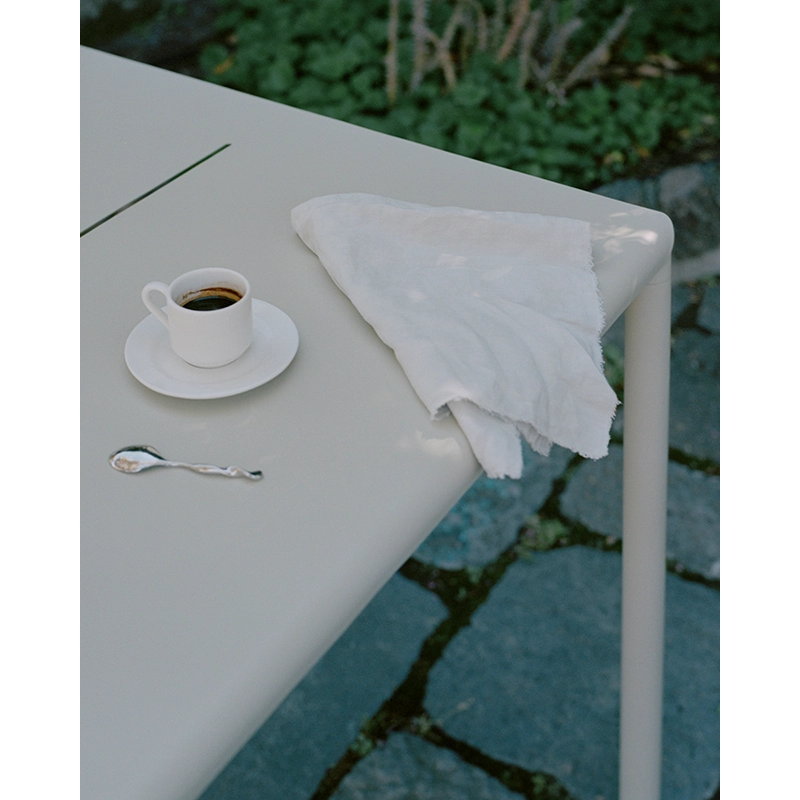 New Works a créé la collection May, comprenant des sièges et des tables spécialement conçus pour les espaces extérieurs. Fabriquée en acier revêtu de poudre, la table May 85x85 est résistante à toutes les conditions météorologiques. Le design de la série May se distingue par sa simplicité élégante et ses détails précis, mariant une surface délicate et poudrée avec un cadre en acier robuste. La table May 85x85 présente une surface avec une fente au milieu pour faciliter le drainage de l'eau, une caractéristique présente également sur les sièges de la série. Cette conception astucieuse crée une répétition de lignes qui apporte légèreté et cohérence à l'ensemble du mobilier d'extérieur. Cette table représente le mariage parfait entre élégance et fonctionnalité, offrant aux espaces extérieurs tels que les jardins, les patios, les terrasses et les balcons un mobilier durable et esthétique. La table May 85x85  de New Works incarne ainsi le compromis idéal entre style contemporain et praticité, ajoutant une touche d'élégance à tout environnement extérieur.