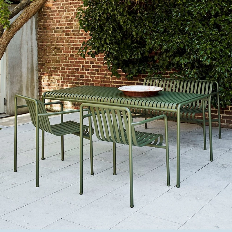 Palissade est une collection de mobilier d'extérieur dessinée par Ronan et Erwan Bouroullec pour la marque Hay. La série est composée d'une large gamme de mobilier, dans laquelle toutes les pièces partagent le même principe de conception. Palissade comprend des chaises, petits fauteuils, fauteuils lounge, tabourets, tables et bancs à l'exemple de la table Palissade 170x90. Spécialement conçues pour un usage extérieur, ces pièces sont visuellement légères mais robustes dans leur réalisation. Inspirée par des meubles classiques, la collection Palissade signée Hay trouve son originalité dans les détails. Bien que conçus en acier, ces meubles outdoor sont confortables simplement grâce à leur design. Chaque pièce est disponible en vert olive, gris clair ou anthracite et s'intègre très bien dans un environnement naturel ou urbain. Avec Palissade, les frères Bouroullec ont imaginé une collection de mobilier outdoor durable qui s'associe facilement à tous les styles : un futur classique du design !