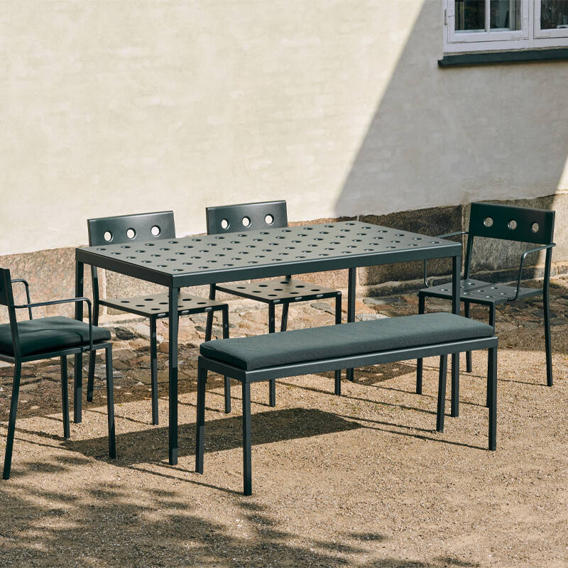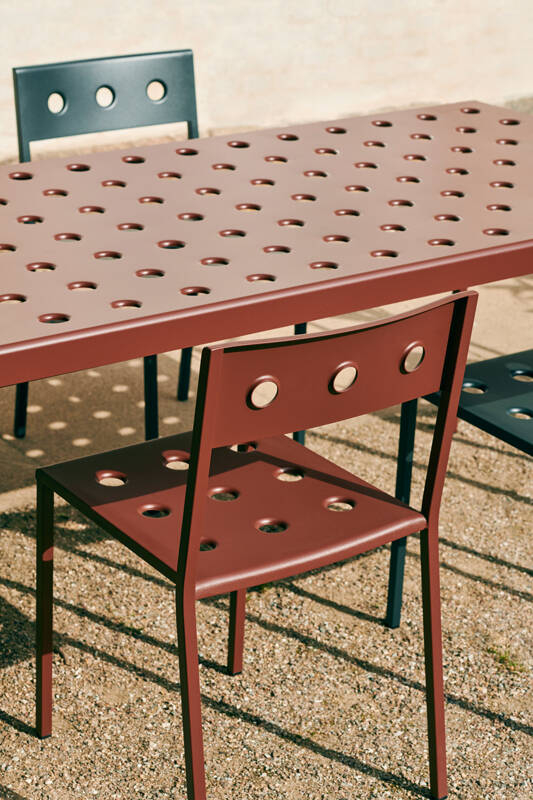 Balcony est une collection de mobilier pour extérieur conçue par les designers Ronan et Erwan Bouroullec pour la marque Hay. Le design carré est adouci par les trous et les bords arrondis, qui donnent non seulement à la collection une expression distinctive, mais aussi renforcent la construction. Toute la collection Balcony est réalisée en acier revêtu de poudre qui reçoit en plus un traitement contre la corrosion. Cette double finition permet une résistance et une durabilité optimale. Déclinée en plusieurs couleurs, la collection de meubles outdoor Balcony est parfaitement adaptée aux balcons, jardins et autres espaces extérieurs. La collection Balcony comprend des chaises et fauteuils empilables, un banc décliné en deux longueurs, une table de repas disponible en trois dimensions et une table basse.