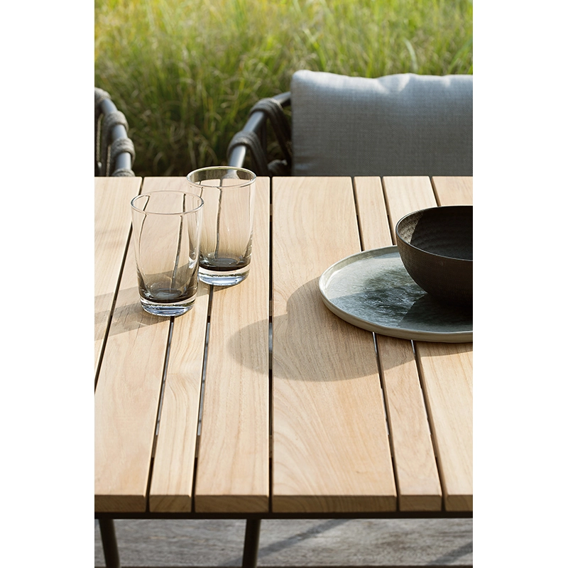 Elégance et praticité sont les atouts de la table Leo de Vincent Sheppard. Conçue avec une expertise exceptionnelle et des matériaux résistants de haute qualité, cette table offre une combinaison parfaite entre style moderne et durabilité. Spécialement conçue pour résister aux éléments extérieurs, son plateau en teck massif, reconnu pour sa beauté naturelle et sa résistance, est soutenu par une structure en aluminium robuste, offrant stabilité et solidité. La table Leo s'adapte harmonieusement à une variété de styles de décoration extérieure. Son allure sophistiquée en fait un choix polyvalent pour les espaces extérieurs, des jardins aux terrasses en passant par des espaces de restauration.