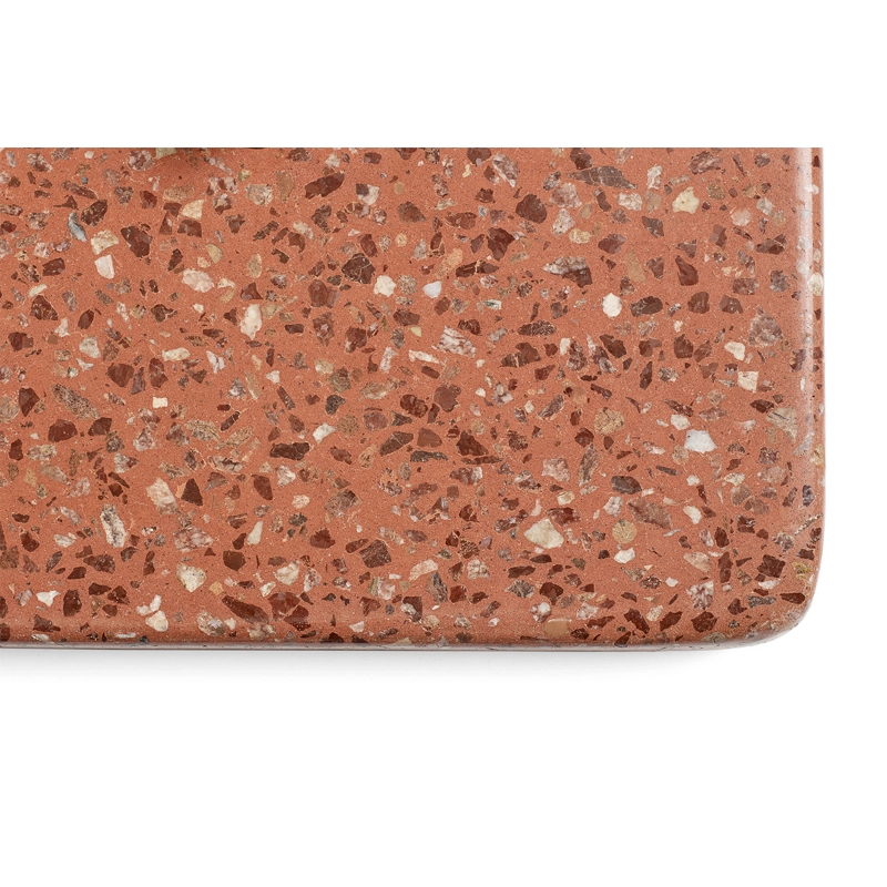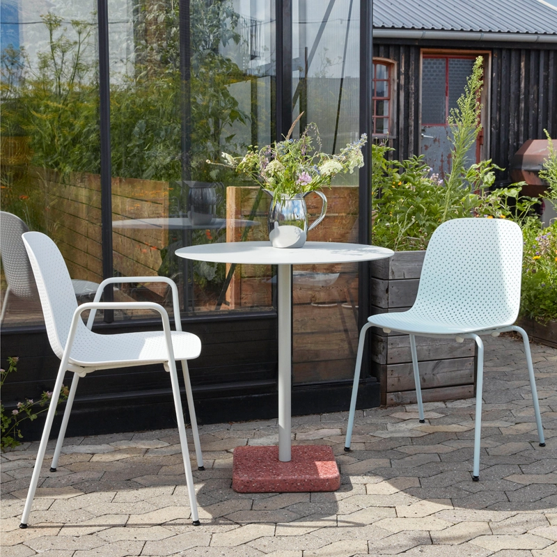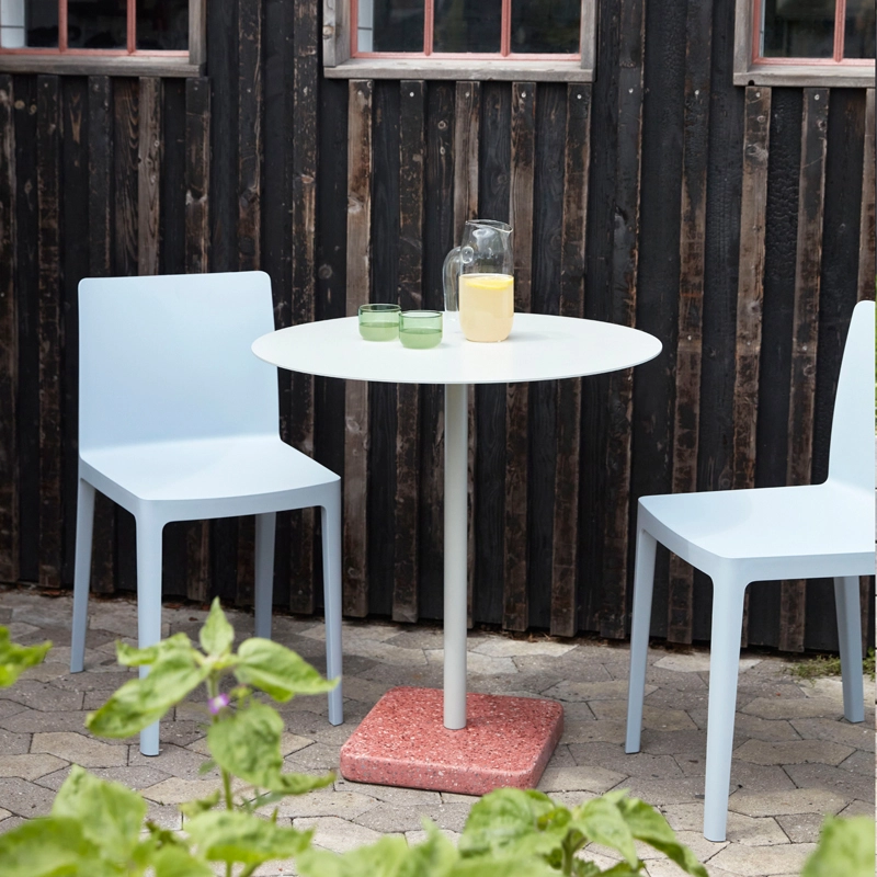 Terrazzo Ø 70 se décline avec un plateau rond ou carré, réalisé en acier électro-zingué avec une finition époxy, pour une meilleure résistance. La base est en terrazzo poli, un matériau choisi pour son aspect durable, mais aussi pour sa finition unique et distincte qui crée un contraste avec la simplicité du plateau. Conçue pour être utilisée dans un jardin, une terrasse ou un balcon, la