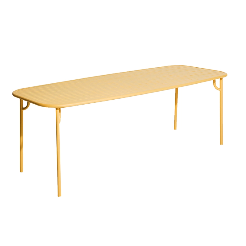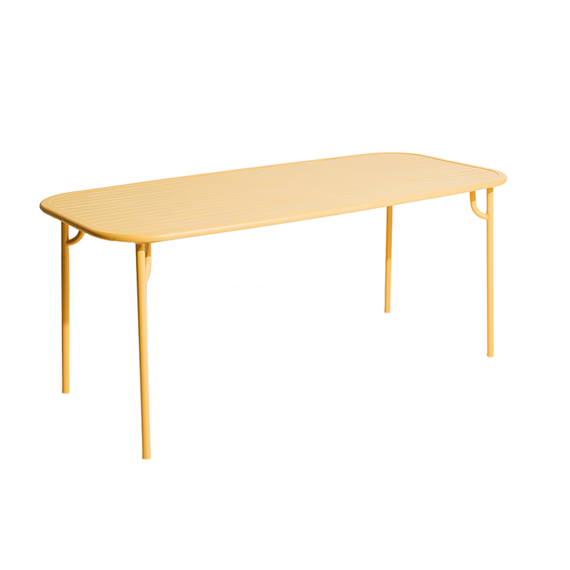 Avec Week-End, la marque française Petite Friture pose son regard singulier sur l’été et propose avec le studio Brichet-Ziegler une approche graphique et contemporaine du mobilier de jardin. La collection Week-End est une gamme de mobilier outdoor complète. Les couleurs précises sélectionnées pour cette collection marquent seules ou en combinaison les lignes d’horizon d’un balcon, d’une terrasse ou d’un jardin. Cette table est disponible en plusieurs couleurs comme le noir, jaune, vert jade … La mise en couleurs de la collection Week-end, de Petite Friture, en peinture poudre époxy anti-UV grainée garantit un maintien impeccable des teintes au cours du temps. La table design proposée par Petite Friture, a été conçue avec l’obsession de tirer le meilleur parti des matériaux et des techniques de réalisation à la disposition des designers. Réalisée en aluminium, matériau sélectionné pour sa légèreté et sa résistance aux intempéries, la collection Week-End allie confort esthétique et sens pratique.