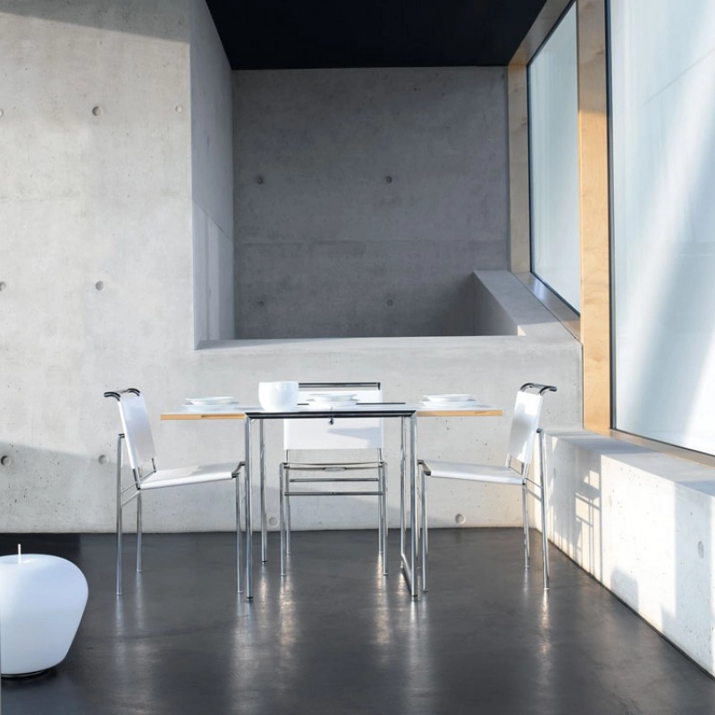 Eileen Gray crée la table Jean en 1929 pour la Villa E1027, située sur la Côte d'Azur. Nommée ainsi d'après son ami, l'architecte Jean Badovici, cette table pliante est constituée d'une structure en acier chromé et d'un plateau laminé blanc avec des bords en hêtre. Classicon édite cette table qu' Eileen Gray avait installée en plusieurs exemplaires dans la villa, servant à la fois de petit bureau domestique ou de table de repas. Léger et stable même déplié, ce classique du design s'intègre dans tous les styles d'intérieurs.