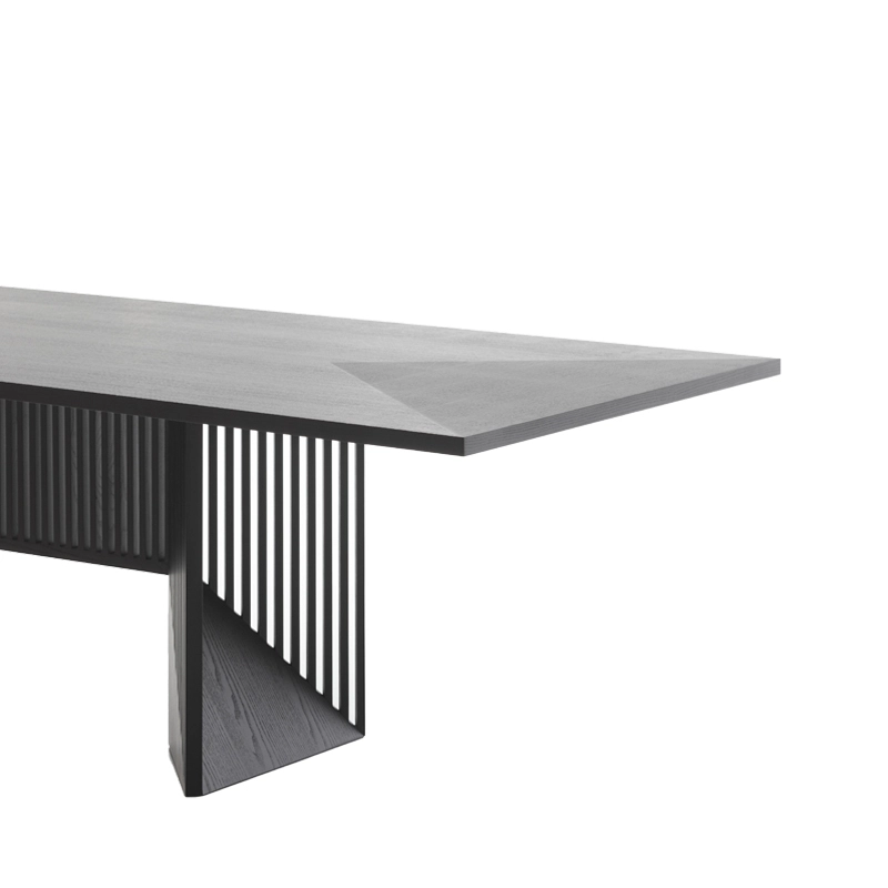 La table Maestro possède un caractère reconnaissable au premier coup d’œil et sa conception résulte d’une exigeante précision. Les essences de bois de frêne et de noyer donnent à la silhouette obscure de Maestro un air plus dramatique mais aussi une certaine stabilité. Ses ailes en porte-à-faux et ses découpes franches font écho aux inspirations japonaises dont elle est issue.