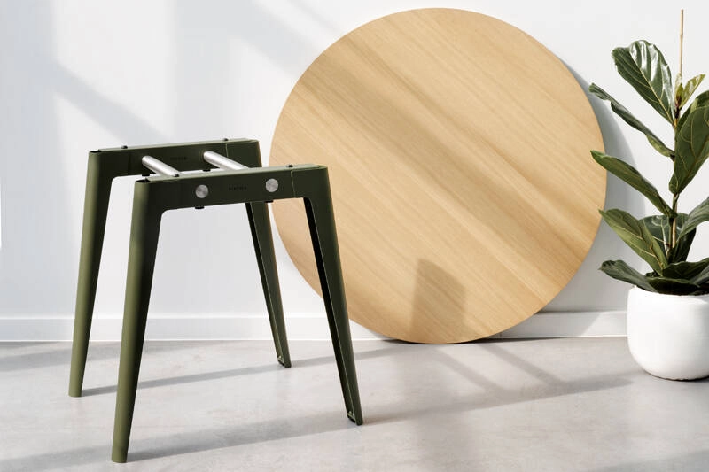 acier thermolaqué, plateau sapin latté massif plaqué chêne naturel, vernis à base d'eau. bois éco-certifié pefc ou fsc