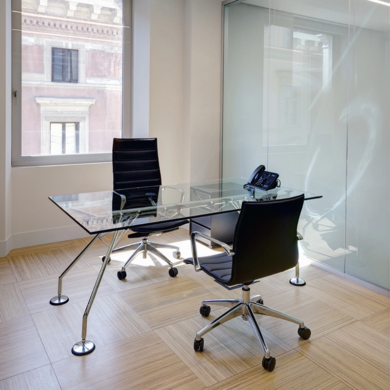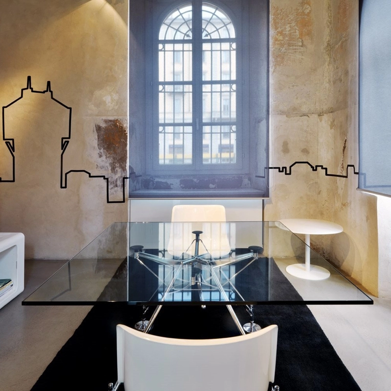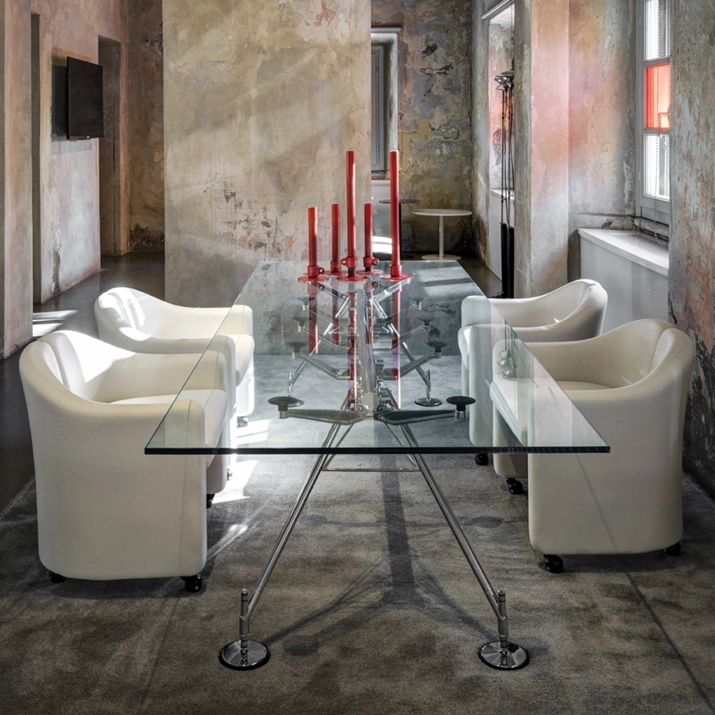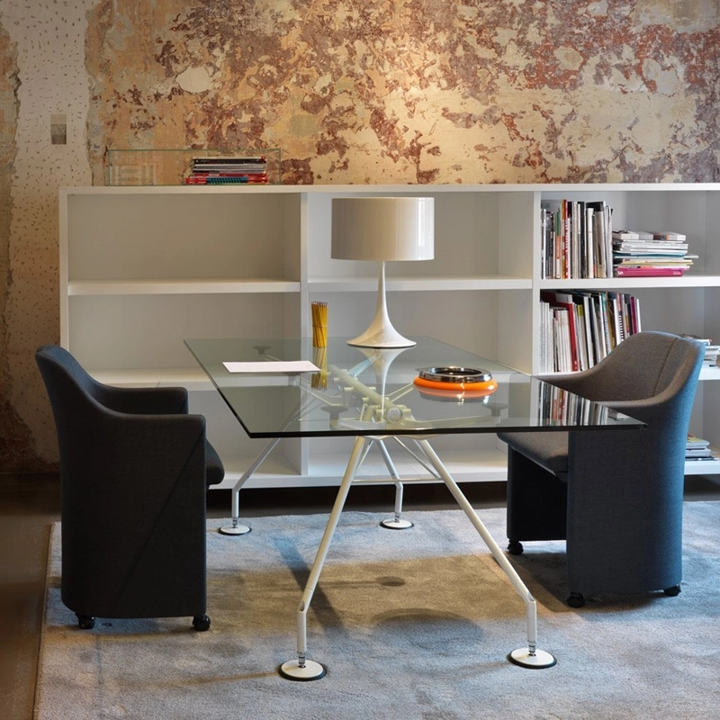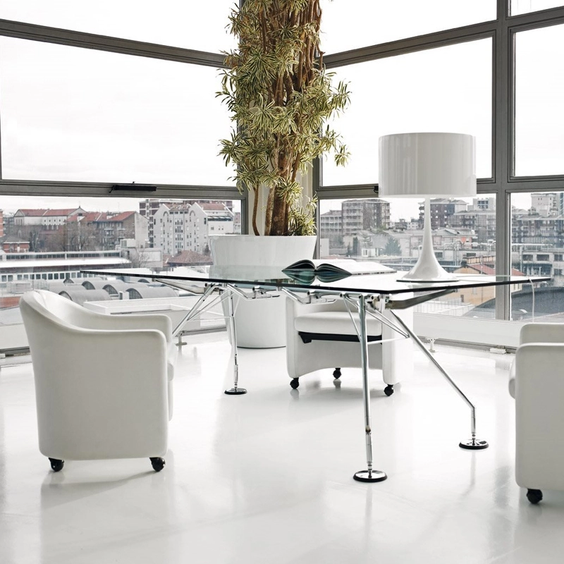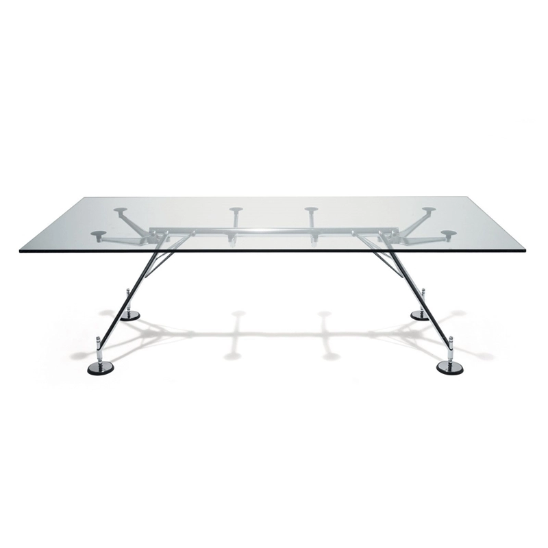 La table Nomos, avec sa structure conçue comme un squelette solide à l'esthétique animale, peut être adaptée à de nombreuses utilisations, à la fois pour les espaces domestiques et pour le monde du travail. L'image élevée et le design raffiné en font un des produits phares du design international et de la production Tecno. Le plateau en verre est posé sur des ventouses visibles par transparence. Dessinée par Norman Foster, la table Nomos propose le choix entre deux hauteurs différentes, 72 cm et 65 cm, simplement en montant les supports avec ou sans entretoise.
