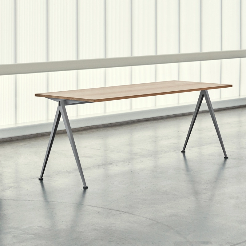 La série de tables Pyramid fait partie des collections relancées par Ahrend en collaboration avec la marque danoise Hay. Cette collection a été créée à l’origine par Friso Kramer et Wim Rietvield alors qu’ils travaillaient chez Ahrend dans les années 50. Considérées comme une création novatrice, les tables Pyramid résultent d’une utilisation innovante de la tôle d’acier sur un produit à la forme organique et contemporaine. Complété par une fine base en tôle d’acier, le plateau rectangulaire en chêne offre à la série Pyramid un caractère fonctionnel et épuré. Résultant d’une construction simple et d’une utilisation de matériaux durables et solides, les tables Pyramid 01 éditée par Hay sont également empilables ce qui les rendent appropriées pour une utilisation au sein d’établissement d’enseignement, d’espaces dédiés aux entreprises et aux particuliers.