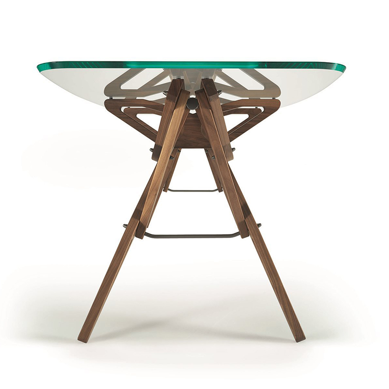 noyer canaletto massif, plateau verre extra- clair à bord coupé oblique, épaisseur 15 mm
