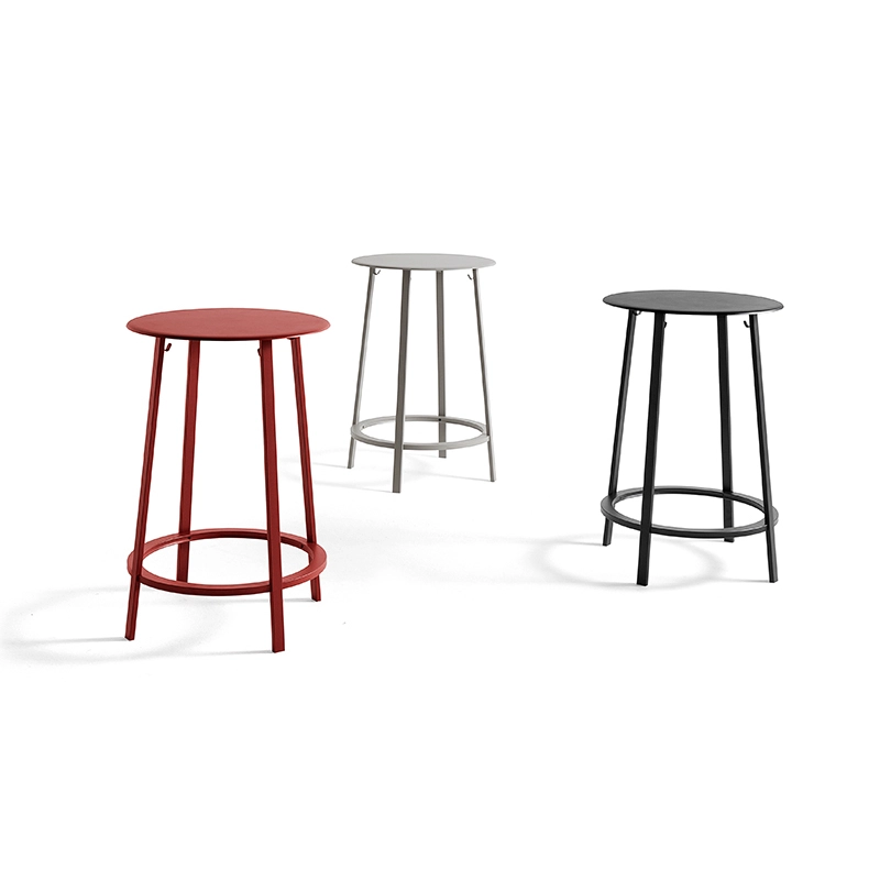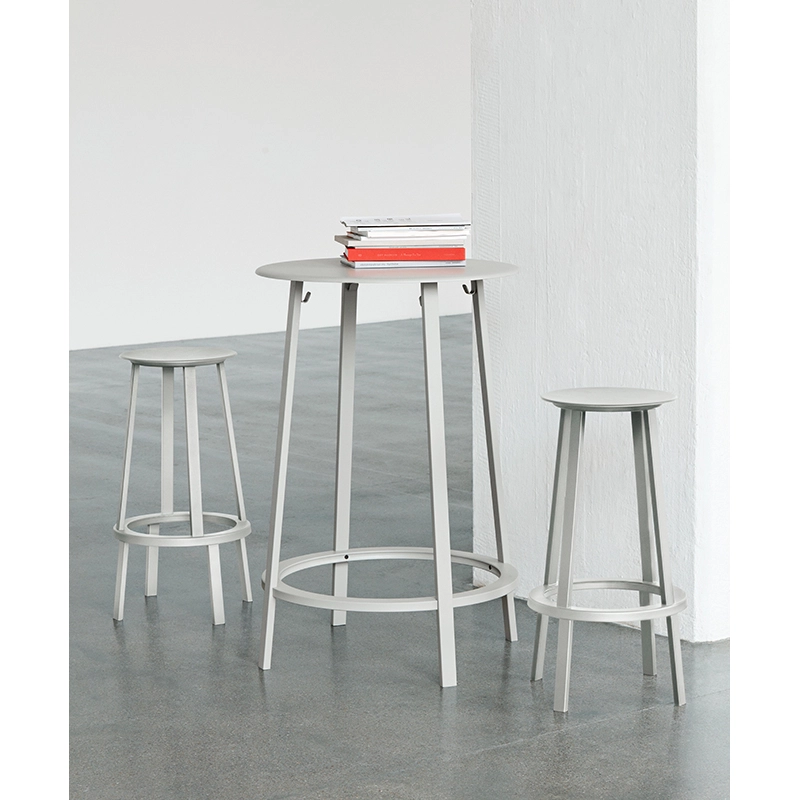 Dessinée par Leon Ransmeier pour la marque Hay, la table haute Revolver est réalisée en acier finition époxy et présente les mêmes arêtes, courbes et le même sens de la symétrie que le tabouret de la même collection. Sur le plan fonctionnel la table Revolver dispose d’un repose-pied circulaire qui sert de support, tandis que des crochets sur les pieds de la table permettent d'accrocher les manteaux et les sacs en toute sécurité en dessous. Disponible en plusieurs couleurs, la table haute Revolver convient à une large gamme de cafés, restaurants et autres lieux publics.