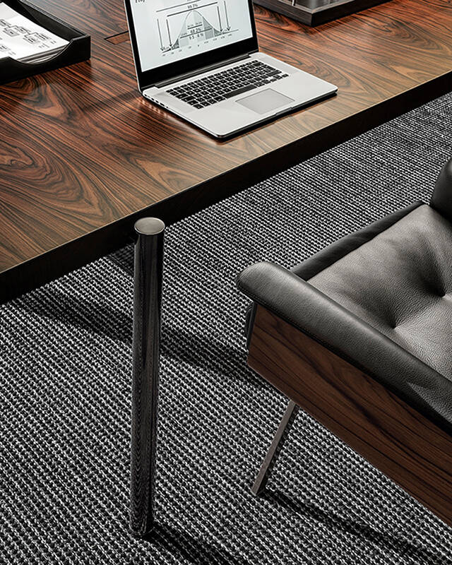 Minotti a décliné en 4 dimensions (de 250 cm à une longueur de 400 cm) la table Superquadra, se déclinant dans des versions qui mettent en valeur ses qualités esthétiques et matérielles : bois de palissandre Santos teinté Dark Brown laqué polyester mat, frêne flammé laqué Noir à pores ouverts et palissandre Santos teinté Dark Brown assorti avec du marbre Sahara Noir laqué polyester mat.