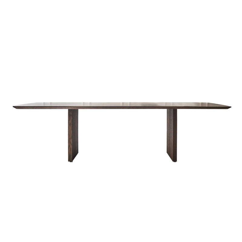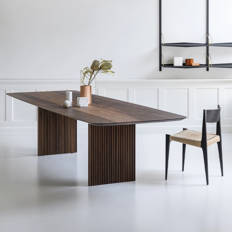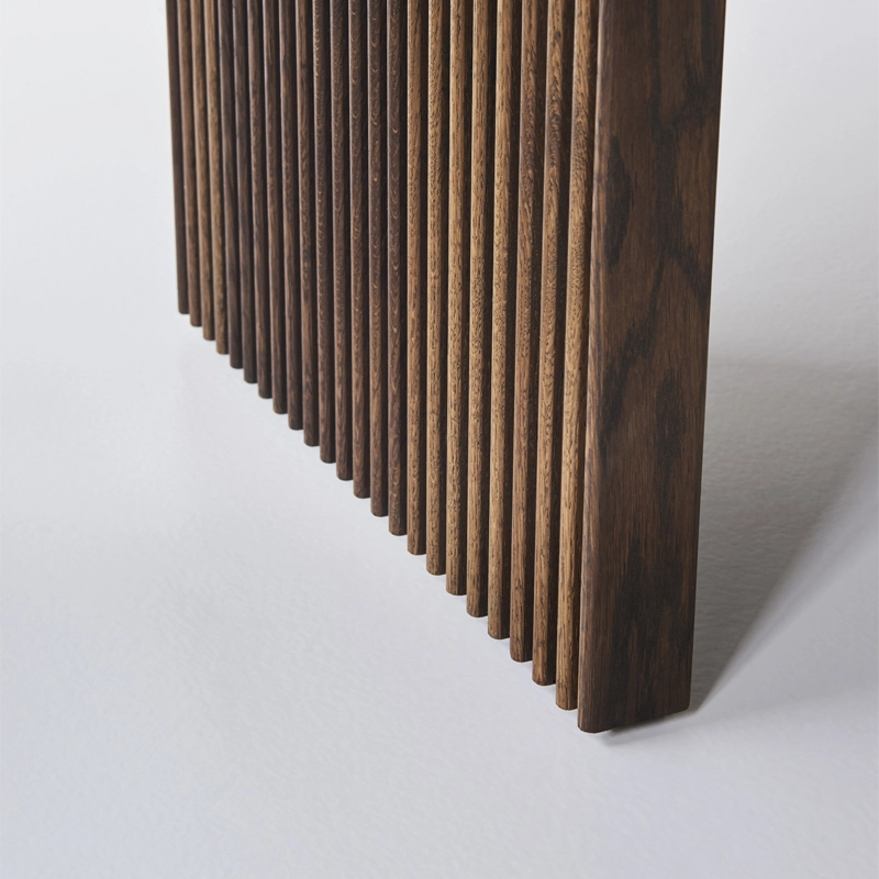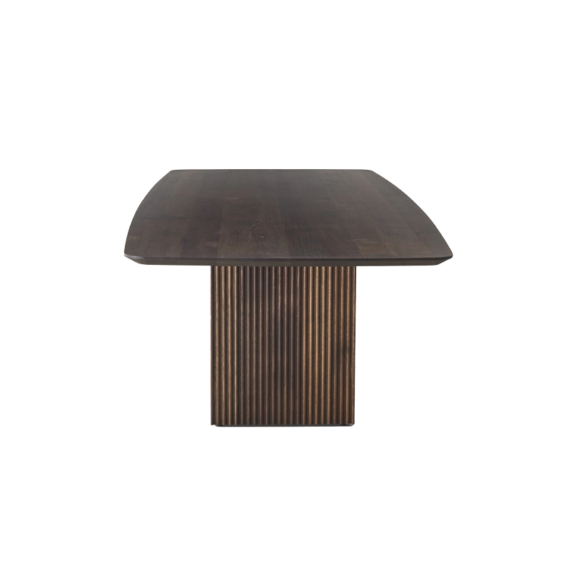 Le plateau et les pieds de Ten sont en bois massif, mais elle réussit à donner une sensation une légèreté, soulignée par les détails artisanaux raffinés comme les belles rainures verticales des pieds et le plateau de table distinctif aux formes organiques. La forme légèrement incurvée du plateau de table ne présente aucune ligne droite et, en combinaison avec le bord incliné de la table, il semble que le plateau bouge constamment, ce qui donne à la table Ten une expression unique.