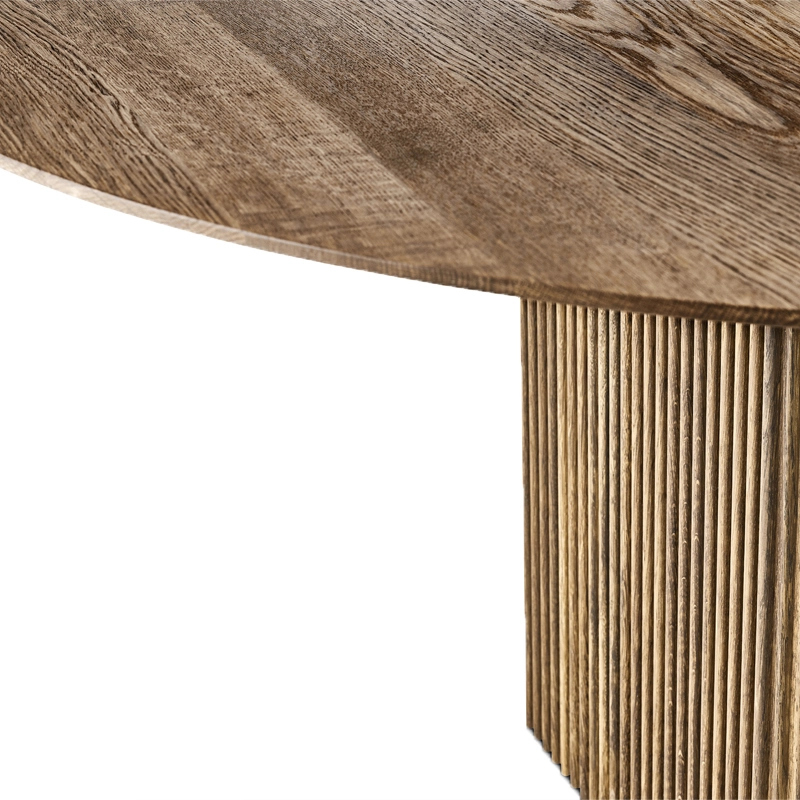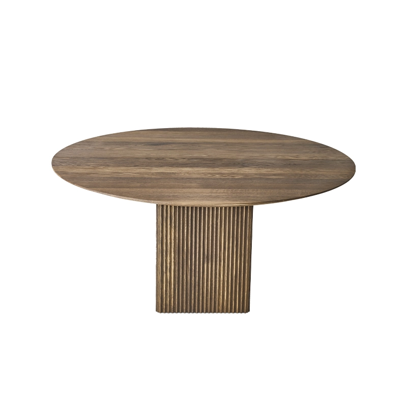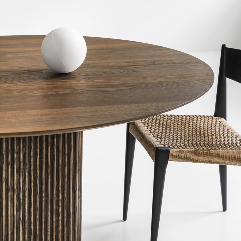Le plateau et les pieds de Ten sont en bois massif, mais elle réussit à donner une sensation une légèreté, soulignée par les détails artisanaux raffinés comme les belles rainures verticales des pieds et le plateau de table distinctif aux formes organiques. La forme légèrement incurvée du plateau de table ne présente aucune ligne droite et, en combinaison avec le bord incliné de la table, il semble que le plateau bouge constamment, ce qui donne à la table Ten une expression unique.