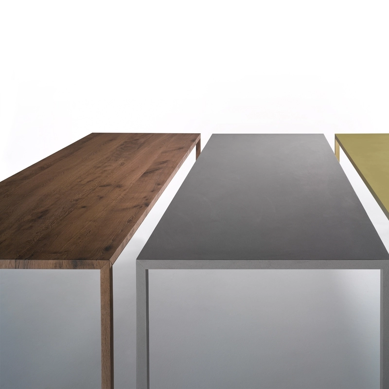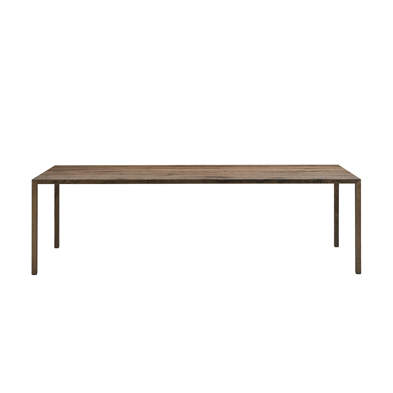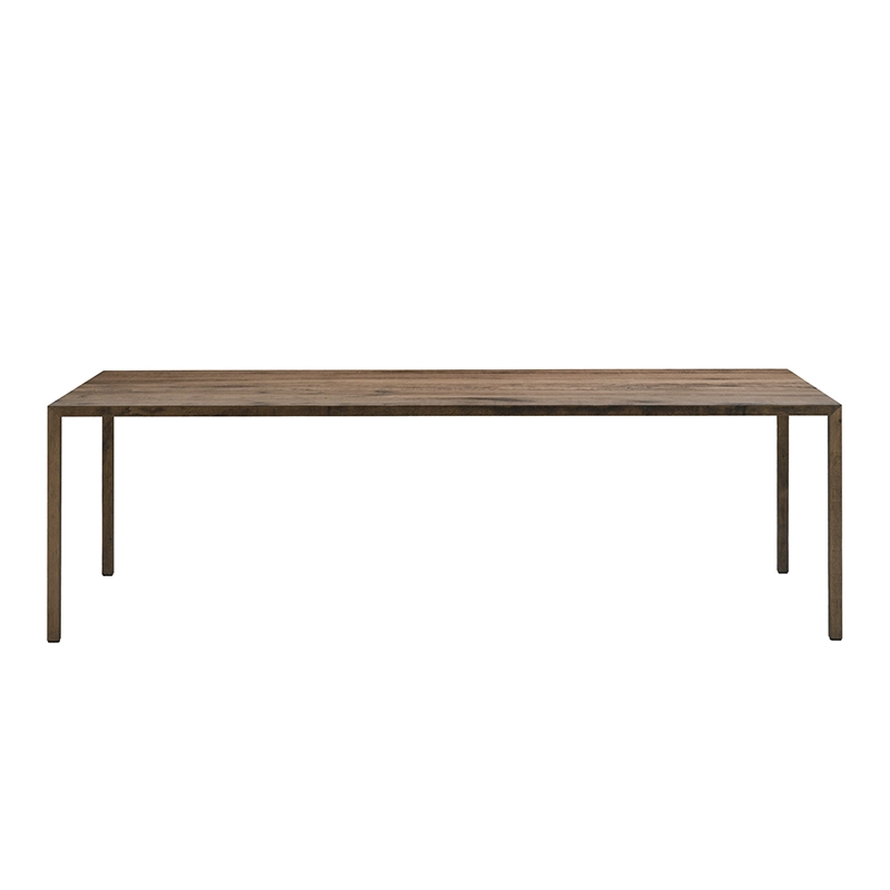 Reconnue pour son design minmaliste et sa prousses technique, Tense est désormais disponible en version bois. Dessinée par Piergiorgio & Michele Cazzaniga, cette table mono matière impressionne par sa capacité à se maintenir en tension, lui permettant d'être réalisée dans des dimensions exceptionnelles. Le plateau d'une extrême finesse de 35 mm, est un panneau composé d'un châssis interne en profilé d'aluminium rempli de polystyrène, puis revêtu d'un placage en chêne. Les pieds en acier, de section 35x35 mm sont également revêtus de ce placage. Les proportions de la table donnent une sensation de légèreté et la finition ajoute une touche chaleureuse. MDF Italia édite une table élégante au design sobre et épuré pour s'intégrer parfaitement à votre salle à manger ou pour un usage professionnel.