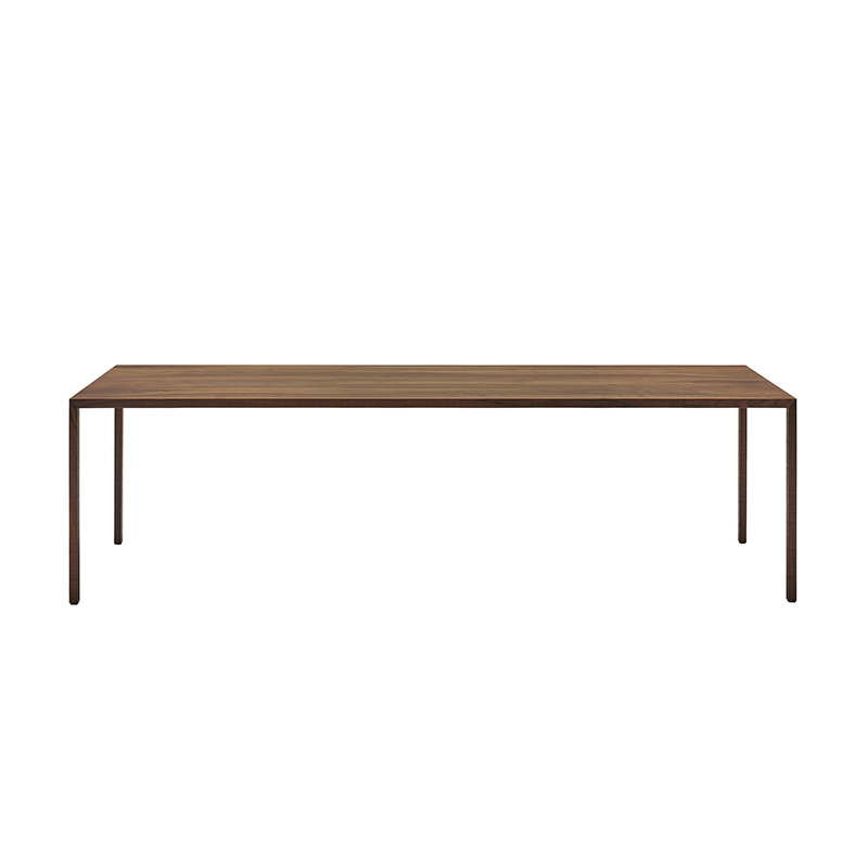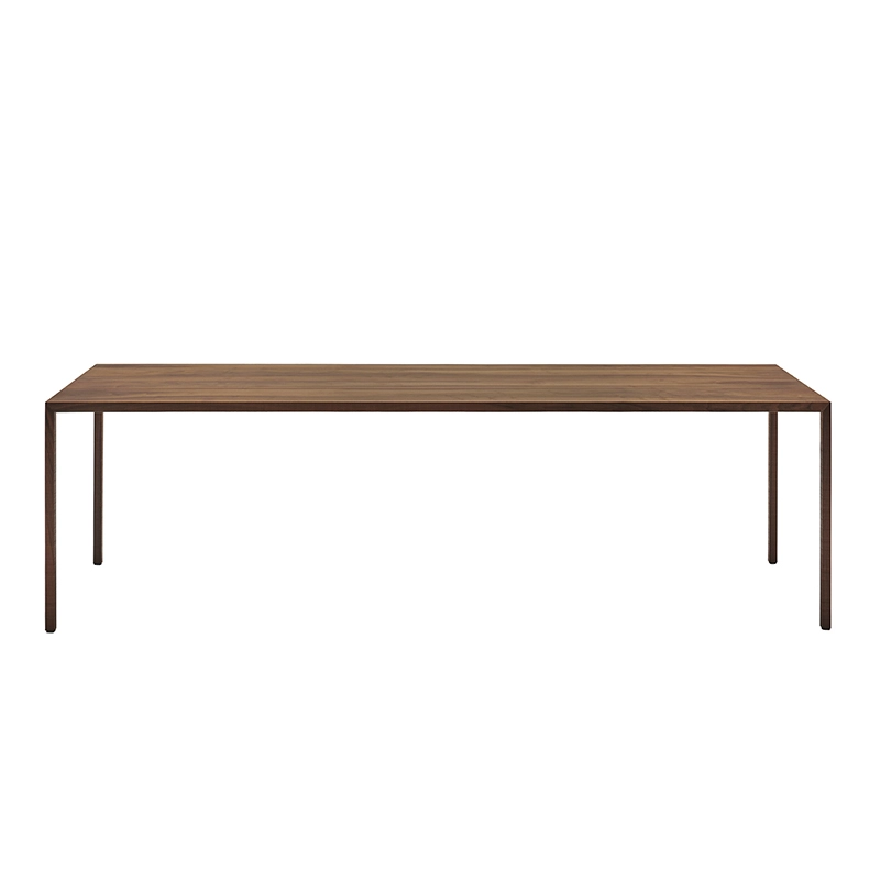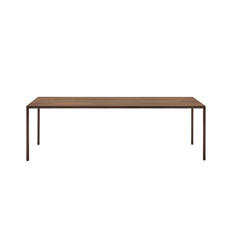 Reconnue pour son design minmaliste et sa prousses technique, Tense est désormais disponible en version bois. Dessinée par Piergiorgio & Michele Cazzaniga, cette table mono matière impressionne par sa capacité à se maintenir en tension, lui permettant d'être réalisée dans des dimensions exceptionnelles. Le plateau d'une extrême finesse de 35 mm, est un panneau composé d'un châssis interne en profilé d'aluminium rempli de polystyrène, puis revêtu d'un placage en chêne. Les pieds en acier, de section 35x35 mm sont également revêtus de ce placage. Les proportions de la table donnent une sensation de légèreté et la finition ajoute une touche chaleureuse. MDF Italia édite une table élégante au design sobre et épuré pour s'intégrer parfaitement à votre salle à manger ou pour un usage professionnel.