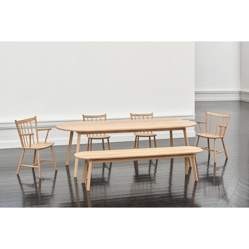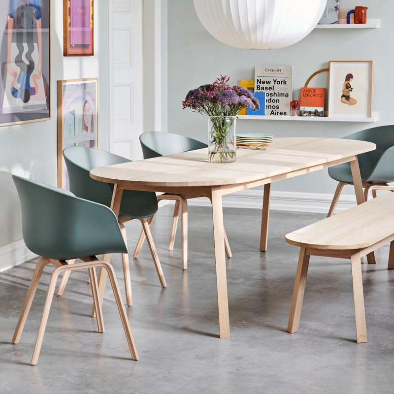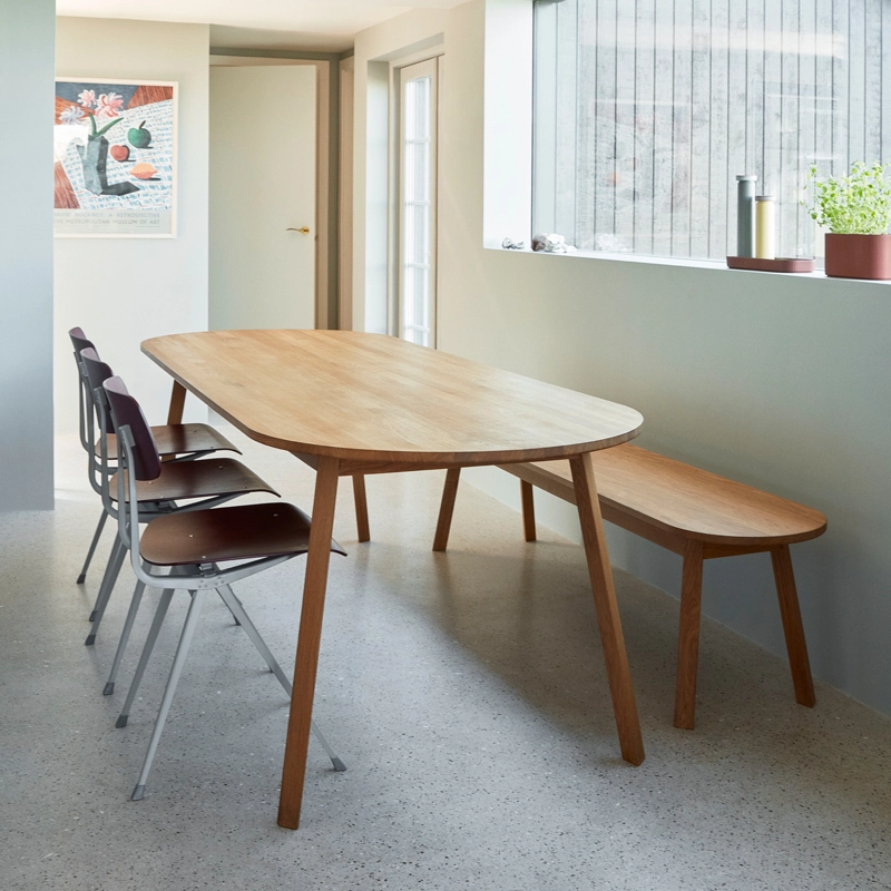 Motivé par le désir de créer plus d'espace autour d'une table circulaire, Simon Jones a conçu la série de tables et bancs Triangle pour Hay. Les extrémités rectangulaires de la table et du banc ont été arrondies pour maximiser le nombre de sièges autour de la table. Fabriquée en chêne massif avec une finition huilée, la série polyvalente Triangle Leg convient à un large éventail d'environnements de salle à manger ou de bureau privés et publics.