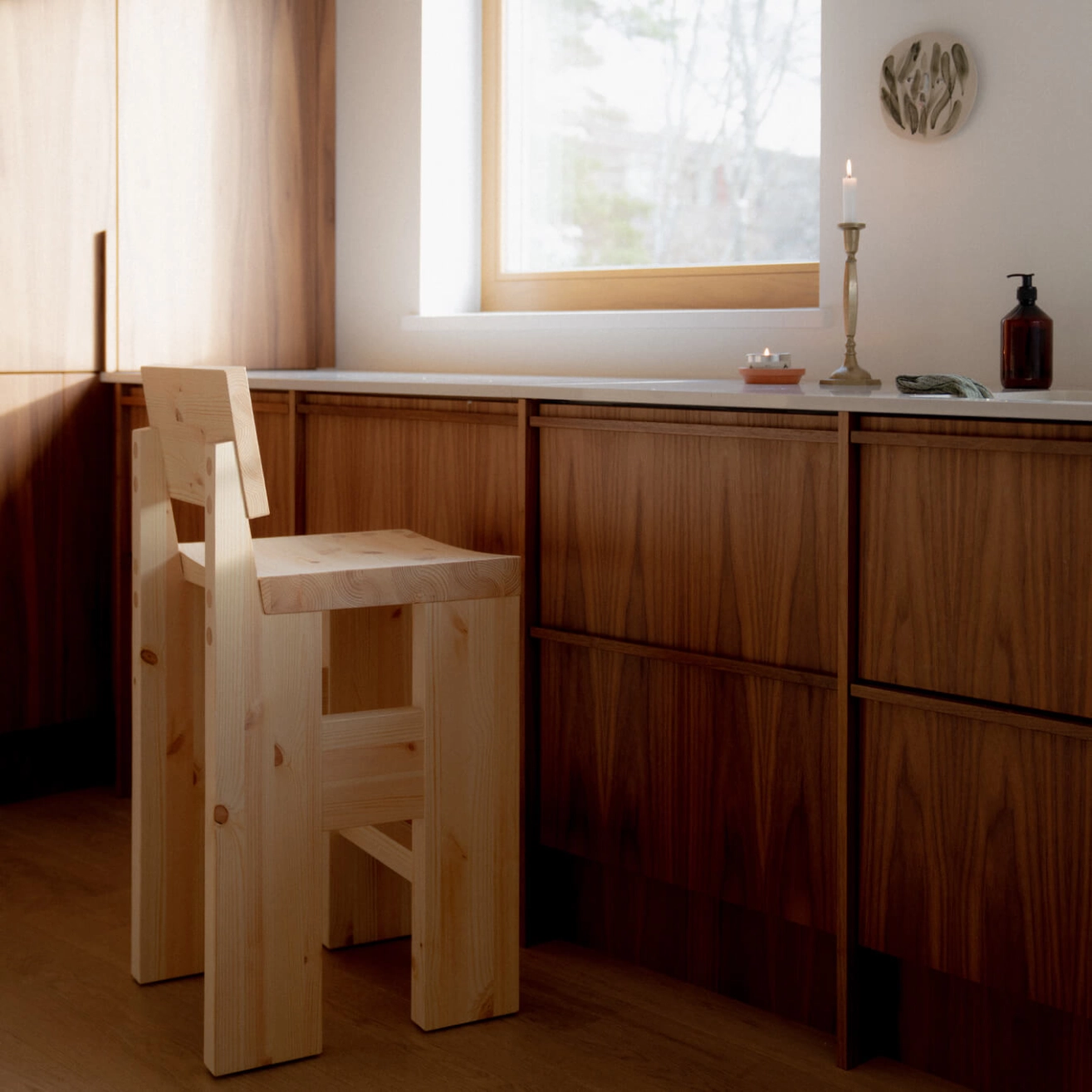 Le tabouret haut 001 de Vaarnii transpose l'esthétique brute et assumée de la collection 001 à une assise en hauteur. Fidèle à la vision du designer Fredrik Paulsen, il combine des volumes généreux et une construction solide, tout en restant fonctionnel et confortable. Conçu en pin finlandais massif, le tabouret haut 001 révèle toute la richesse naturelle du bois à travers son grain vivant et expressif. Il existe en deux tailles (65 et 70 centimètres).Que ce soit dans une cuisine, autour d’un îlot ou dans un espace professionnel, le tabouret haut 001 de Vaarnii incarne une présence forte et intemporelle.