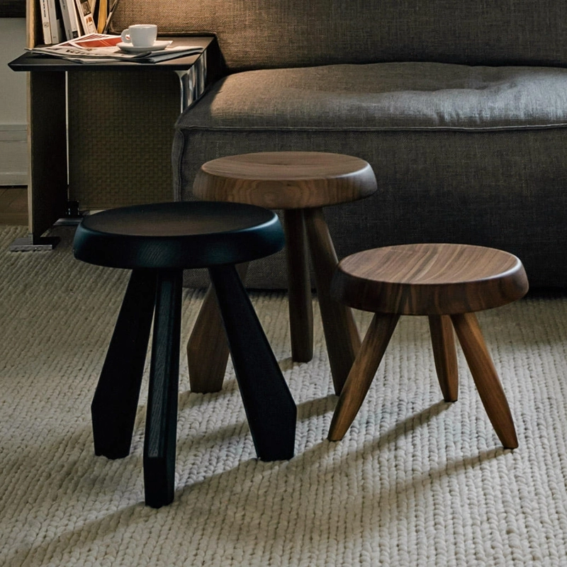 Dessiné dans les années 50, le tabouret Méribel tient son nom du chalet où la designer Charlotte Perriand a séjourné. Il fait partie d'une série basée sur la réinterprétation de l'architecture locale des Alpes. C'est un tabouret simple et robuste en bois massif, qui se caractérise par ses trois pieds tranchés. Cette version stylisée du tabouret de traite classique est disponible en chêne naturel, chêne teinté noir ou en noyer américain naturel. Inspirée par des matériaux simples et des formes élémentaires, Charlotte Perriand conçoit une pièce intemporelle et chaleureuse. Réédité par Cassina, 523 Méribel peut être associé à la version basse du tabouret, Berger, et utilisé comme table d'appoint, en bout de canapé par exemple.