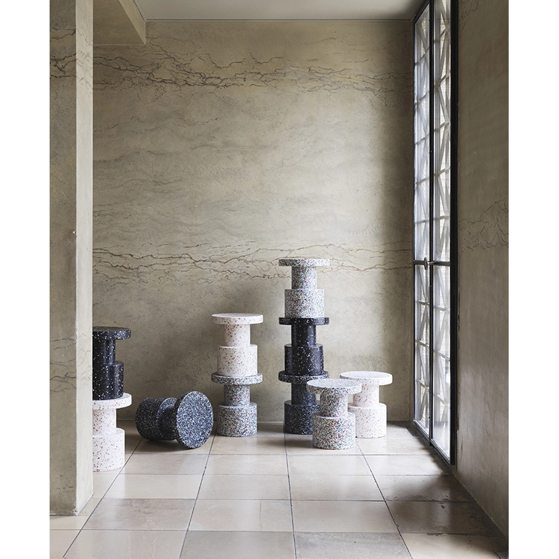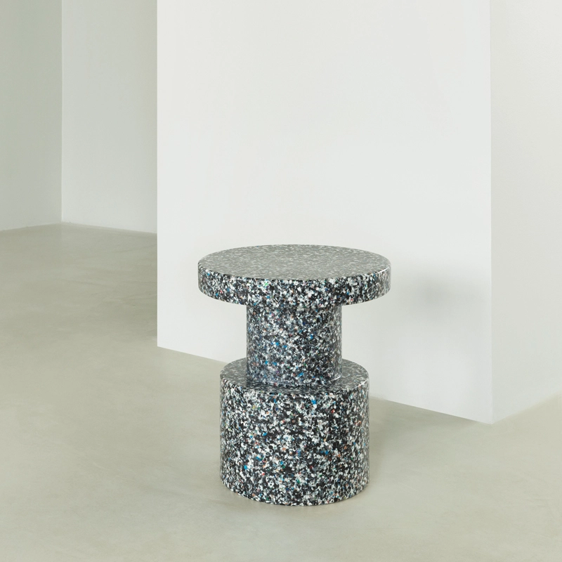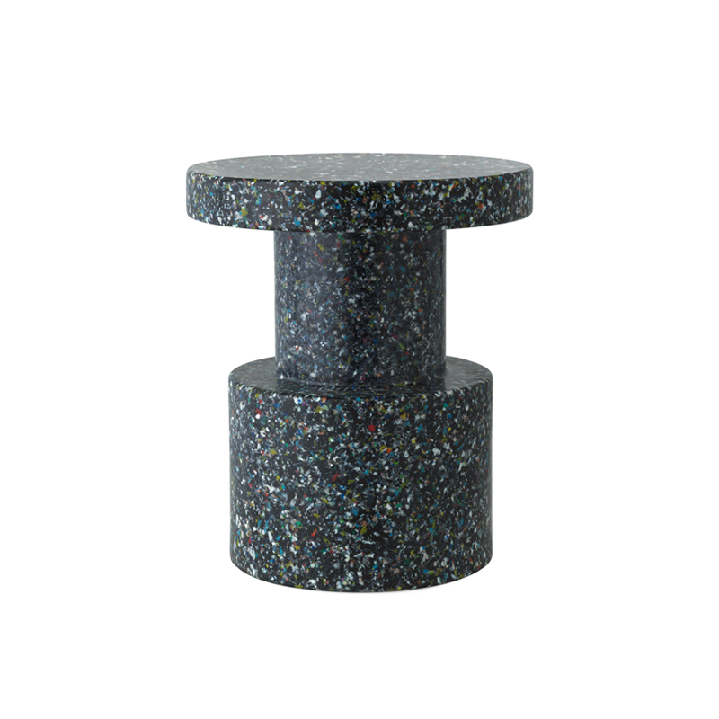 Bit est un meuble pluriel et sculptural qui peut avoir de multiples fonctions dans un intérieur. Vous pouvez par exemple utiliser Bit comme piédestal pour une belle décoration florale, comme table d’appoint pour y poser une lampe ou comme tabouret pour un convive supplémentaire. Pour concevoir le multifonctionnel Bit, le designer Simon Legald s’est inspiré de formes immuables comme les monolithes et les piliers. La rigueur de sa forme est brisée par sa surface caractéristique et pixélisée grâce aux petits morceaux de 100% plastique recyclé d’origine industrielle et ménagère. Une méthode particulière où les fragments de plastique sont chauffés jusqu’à leur point de fusion à 120 degrés, et qui permet de recycler et de refusionner la matière un grand nombre de fois sans modifier ses propriétés. Il en résulte une profondeur et une composition singulières rendant chaque table Bit unique. Bit est disponible en quatre jolis coloris. Alors que la production et la matière sont mises en évidence par l’aspect multicolore et gris chiné, la table noire et blanche s’intègre humblement dans un intérieur existant. Avec sa forme subtile et son jeu de couleur accrocheur, Bit donne de la personnalité à toute décoration intérieure. Le tabouret Bit résiste aux températures allant de - 10 à 50 °C et trouvera sa place à l’intérieur comme à l’extérieur.