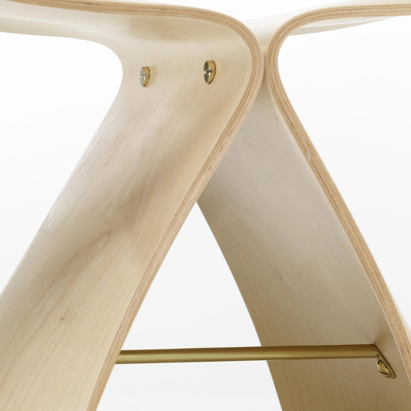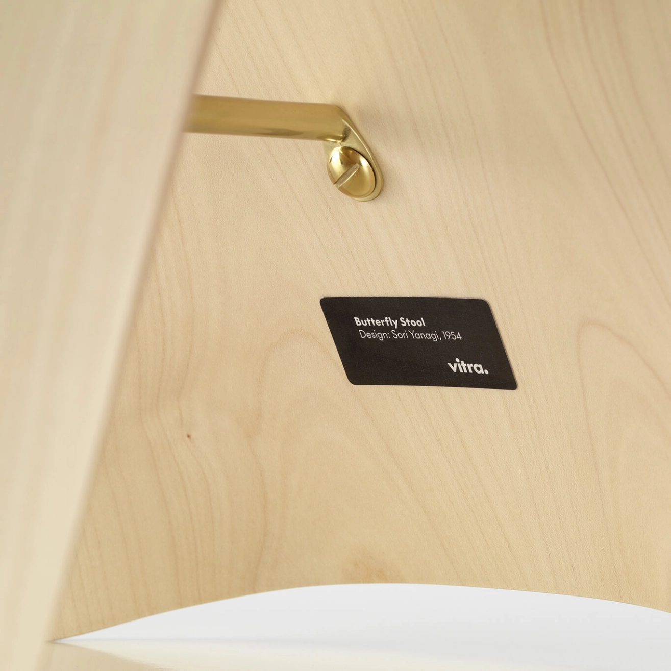tabouret Butterfly Stool se compose de deux formes identiques incurvées en placage de bois moulé, reliées par une barre en laiton et deux boulons. Il en résulte un siège dont la forme fait penser d’une part aux coffrets shintoistes, les « torii » et d’autre part à un papillon en vol, dont l’élégant tabouret tient le nom. Le