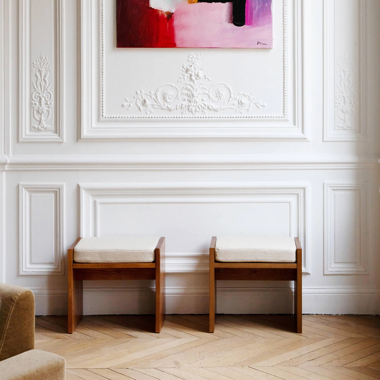 Polyvalent, le tabouret Chiesa s’utilise aussi bien comme siège d’appoint, bout de canapé ou table d’appoint, trouvant naturellement sa place dans un salon, une chambre ou un bureau.