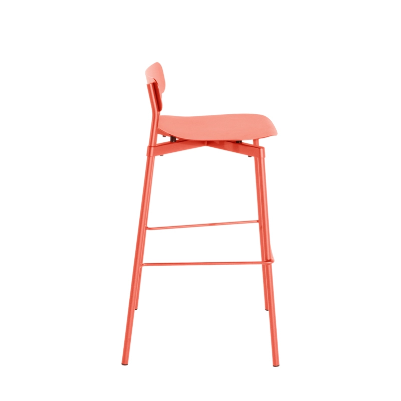 La collection Fromme offre plusieurs avantages fonctionnels : confort grâce à l’assise légèrement incurvée et aux amortisseurs placés sous le siège, usage indoor et outdoor grâce au choix de la fabrication en aluminium et d’une peinture matte grainée traitée anti-UV. Le tabouret haut Fromme résistant à l’eau et certifié pour un usage extérieur intensif, mais s'intègre aussi très bien à l'intérieur.