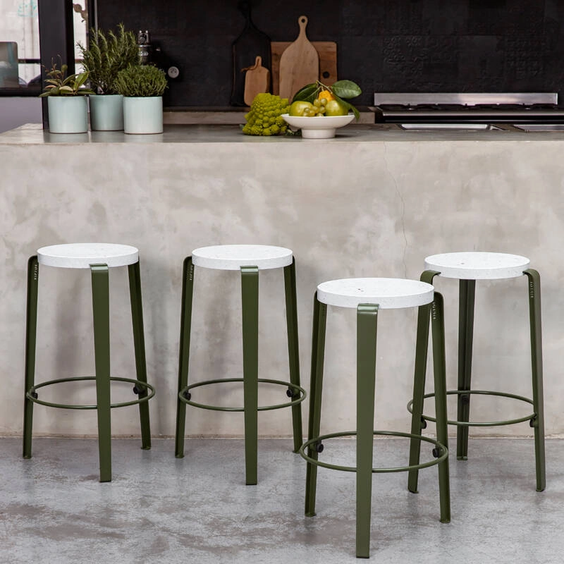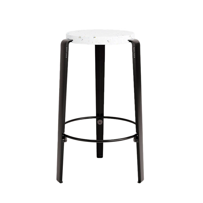 Le tabouret mi-haut MI LOU d'une hauteur de 66 cm conçu par TIPTOE est un objet créatif et polyvalent à utiliser avec un plan de travail classique, un îlot central ou avec les pieds de table TIPTOE pour plan de travail de 90 cm. De fabrication 100% Européenne, le tabouret haut Big Lou combine un design malin, une installation facile et une très bonne résistance au temps. Les pieds, en acier thermolaqué sont associés à une assise en plastique recyclé. Ce matériau innovant et durable est obtenu grâce au recyclage de pots de yaourts ! Ce plastique se distingue par sa surface composée d'une multitude d'éclats colorés, créant une assise originale et unique.  TIPTOE est une marque française ancrée dans une démarche durable.