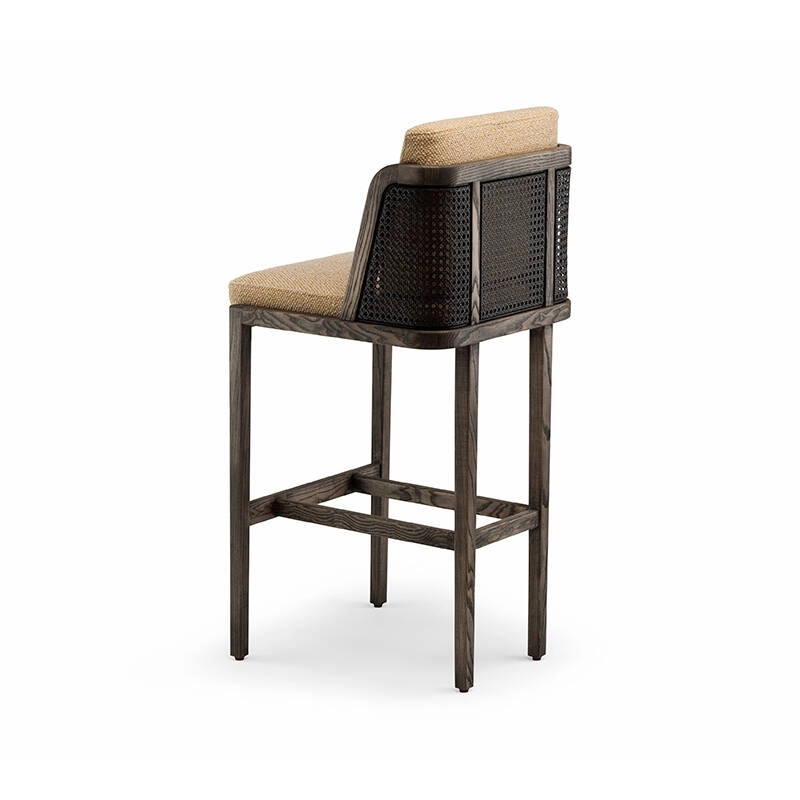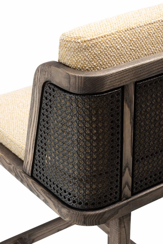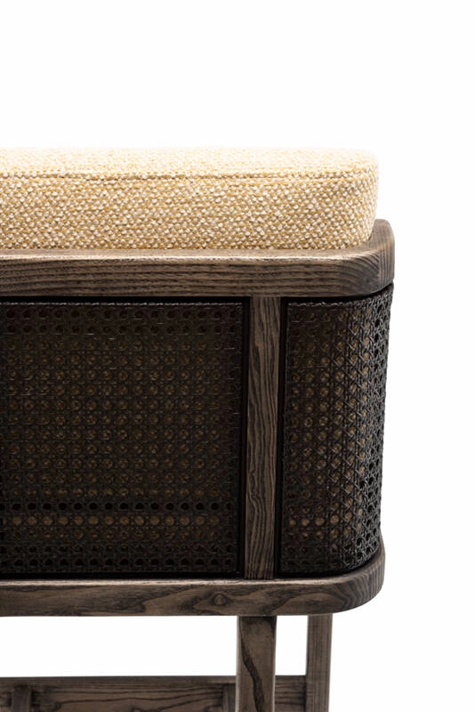 Le tabouret de bar Throne de De La Espada marie tradition et modernité, rappelant les influences Art déco d'Autoban. Throne fait partie d'une famille de meubles qui comprend une chaise de salle à manger, une chaise longue et un canapé, disponible avec un dossier en rotin ou rembourré.