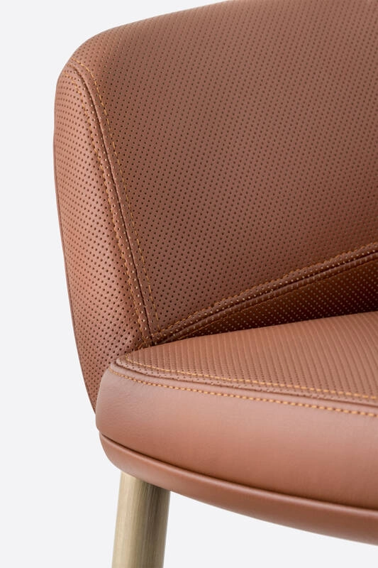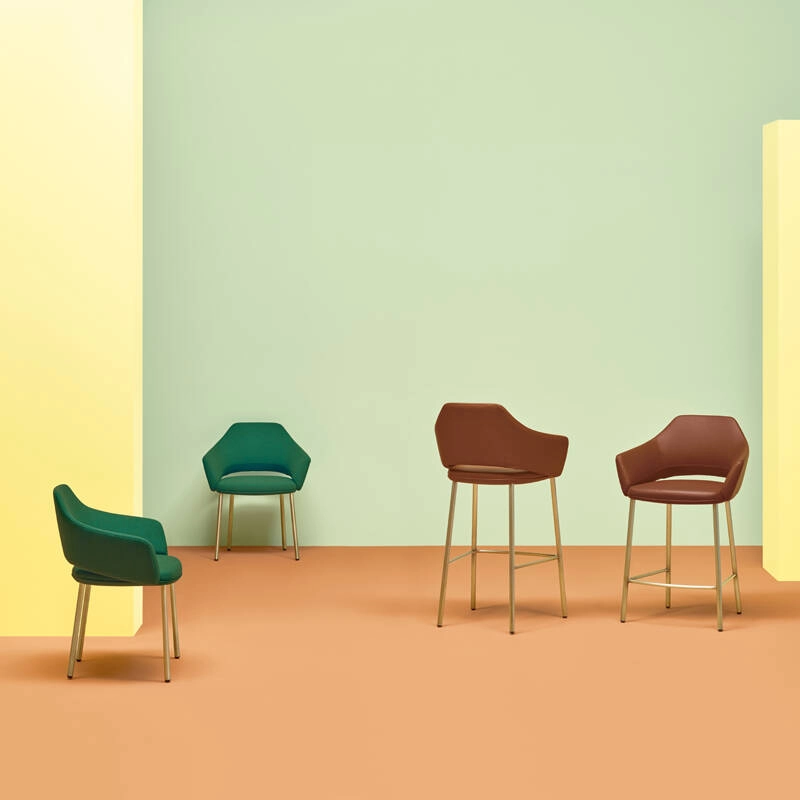 Dessinée par Patrick Norguet pour la marque Pedrali, Vic est une collection de sièges rembourrés enveloppants et élégants dans leur simplicité. Inspirée des formes classiques, la collection se distingue par son dossier, fixé à l’assise seulement par les extrémités, créant une ouverture qui donne une sensation de légèreté et facilité le déplacement du siège. Dans la version tabouret haut, les pieds en tube d’acier allègent la silhouette tout en constituant une base robuste. Le siège est proposé ici en cuir perforé (à l’intérieur du dossier et sur l’assise), mais est déclinable également en tissu dans de nombreux styles et coloris. Editée par Pedrali, la collection s’intègre aussi bien dans les environnements professionnels que dans les espaces domestiques. Vic est disponible également en version petit fauteuil et chaise.