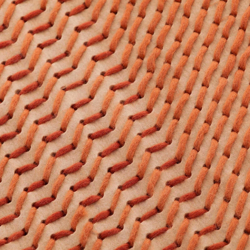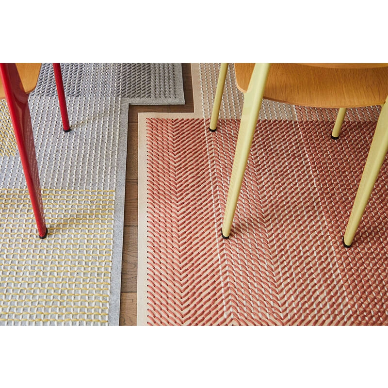 Avec Canevas Geo, Charlotte Lancelot utilise de façon totalement différente les possibilités offertes par la technique qu’elle a conçue pour la collection Canevas. Utilisant la même technique du point de croix en laine sur une base de feutre perforé, Canevas Geo explore les nuances de couleurs et les différents effets qui se créent lorsqu’elles se superposent. En se mélangeant les unes aux autres, les couleurs rappellent les champs cultivés vus du ciel. Cette composition associée à la forme asymétrique du tapis Gan créent une pièce à l’allure vraiment contemporaine et rafraîchissante.