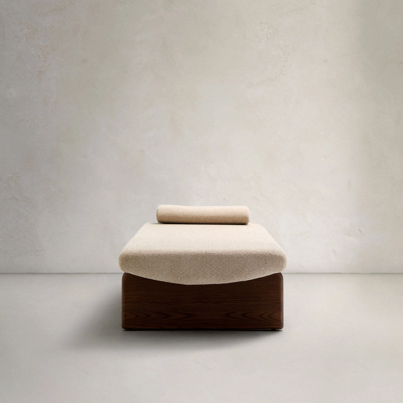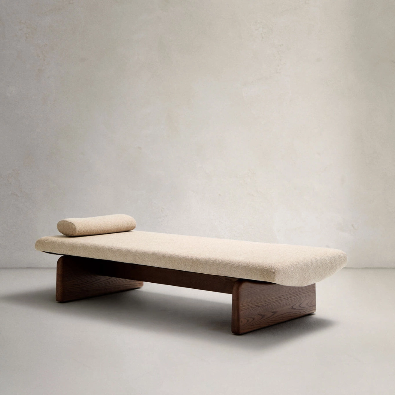 Structure en bois de frêne teinté noyer, matelas et coussin en tissu chenille beige (inclus), rembourrage mousse