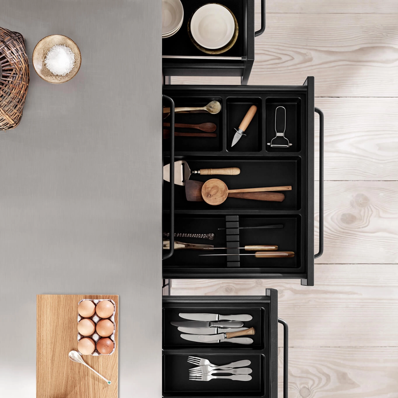 La cuisine V1 grise de Vipp incarne l'esprit de simplicité et de durabilité qui caractérise la marque depuis 1939. Conçue pour durer toute une vie, chaque détail de cette cuisine a été soigneusement pensé et parfaitement intégré, alliant fonctionnalité et esthétisme intemporel. Loin des tendances éphémères, elle se distingue par son design épuré et sa robustesse, avec une attention particulière aux matériaux et aux finitions. La V1 grise est un modèle de cuisine modulaire, offrant une flexibilité totale pour s’adapter à différents espaces et besoins. Que vous choisissiez un îlot de cuisine, un îlot avec espace de détente, une unité murale ou une grande colonne de rangement, chaque module est conçu pour optimiser l'usage quotidien sans compromis sur la qualité. Le tout, dans une finition grise élégante et discrète, qui s'intègre parfaitement dans tous types d’intérieurs modernes. Chaque module de la V1 grise est une invitation à redécouvrir la cuisine comme un espace de partage, de convivialité et de créativité. Son design sobre, ses lignes nettes et ses matériaux durables font de cette cuisine V1 un choix idéal pour ceux qui recherchent une solution de rangement fonctionnelle et un cadre de travail agréable, tout en restant fidèle à l’idée d’un produit qui résiste à l’épreuve du temps.