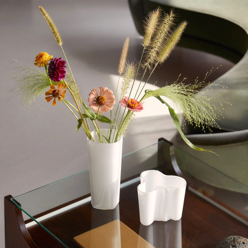 Alvar Aalto est une des figures les plus importantes du design et de l'architecture du 20ème siècle. Il a créé son propre style en s'inspirant de l'homme et de la nature. Aalto pensait que le bon design devait faire partie du quotidien et a créé, dans ce sens, des produits aux multiples utilisations, sensibles, et qui améliorent la vie quotidienne. Il n'a jamais indiqué comment ses objets en verre devaient être utilisés, souhaitant que l'utilisateur décide lui-même de sa fonctionnalité. Les formes ondulantes, fluides et organiques des objets de cette collection rappellent les milliers de lacs qui rythment le paysage finlandais. Les souffleurs de verre du fabricant Iittala réalisent toujours à la main ces vases légendaires à la beauté sereine. Le vase Aalto est disponible en plusieurs hauteurs et se décline en plusieurs couleurs. Depuis sa présentation en 1937 à l'Exposition Universelle de Paris, la collection Aalto est devenue un véritable chef d'œuvre.