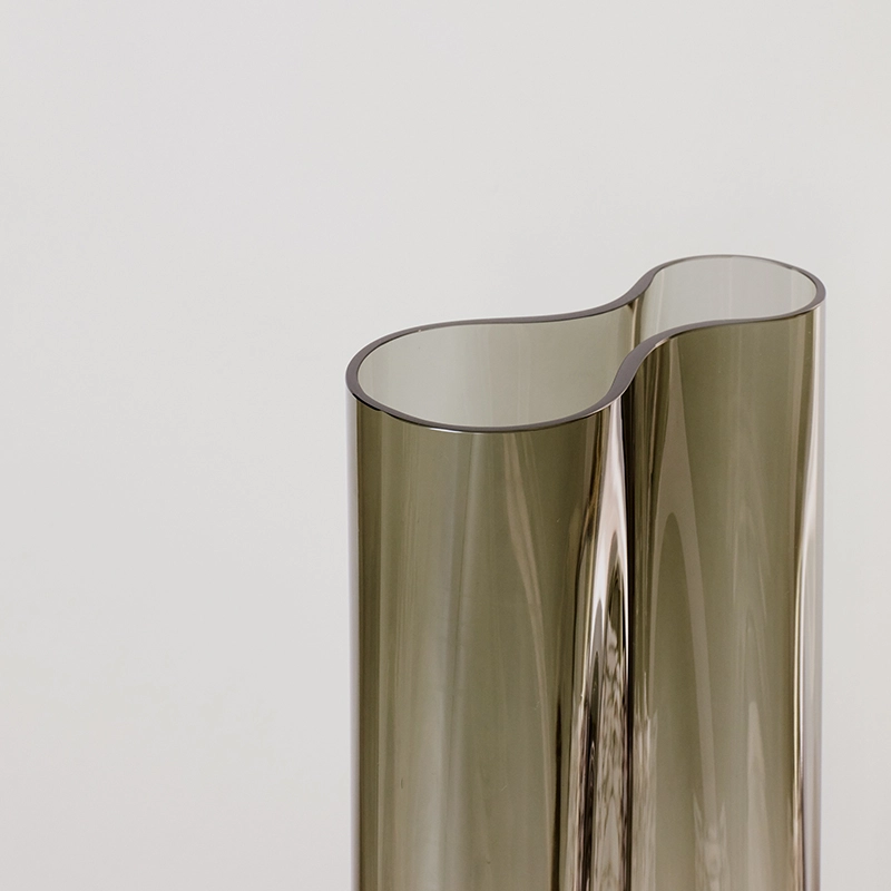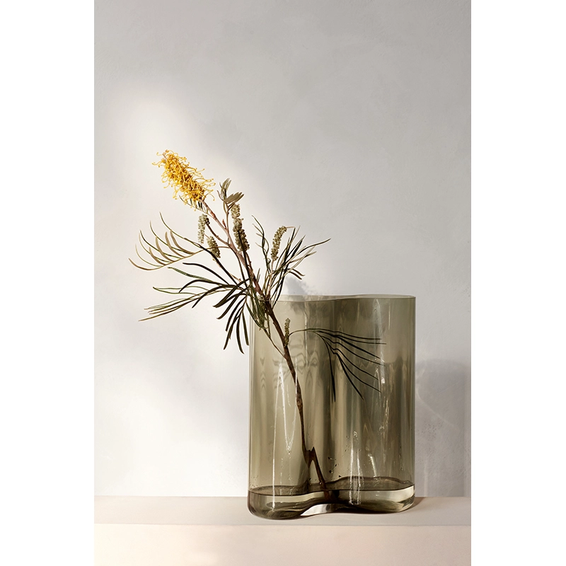 vase Aer est parfait aussi bien seul qu’en duo pour exposer des fleurs ou des branches. La surface tactile et ondulante du verre, est produite selon un procédé précis où le verre est soufflé à la bouche dans un outil à deux cavités qui révèle la forme complexe en trois dimensions. Le