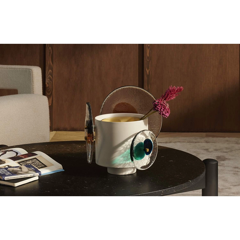 vases ColourDisc est réalisée en laiton peint et arbore des décorations en verre fixées par deux épingles en laiton. À l'intérieur de cette structure, un