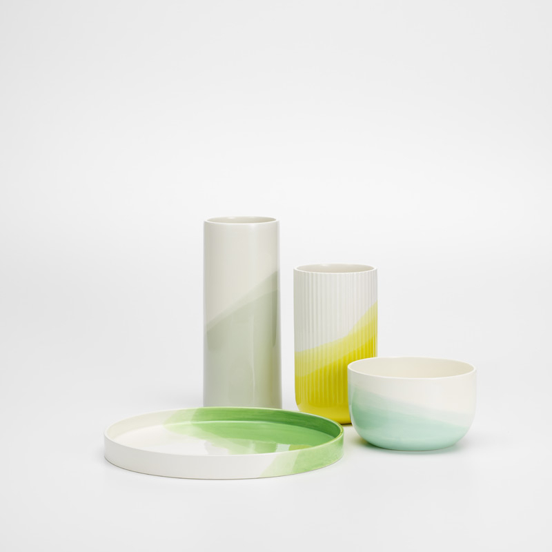 Créée par Raw-Edges pour l'ameublement et l'agencement d'un étage entier de la VitraHaus sur le Vitra Campus, la collection Herringbone est née de l‘intérêt du studio pour la technique de la teinture par immersion. Les Herringbone Vessels sont créés en plongeant à plusieurs reprises des bols et des vases en céramique dans une glaçure colorée. Ce processus réalise un motif obéissant à une logique intrinsèque, déterminée par l‘angle d‘immersion ainsi que par la forme et le poids de l‘objet. La transformation de différents matériaux et formes par trempage dans un bain de teinture exerce une fascination presque magique sur le duo de designers Shay Alkalay et Yael Mer, ce qui a conduit à la décision d‘affiner encore la conception de la collection Herringbone pour la production en série chez Vitra. Entièrement réalisé à la main, chaque bol, vase et plateau de la collection Herringbone Vessels est un objet unique.