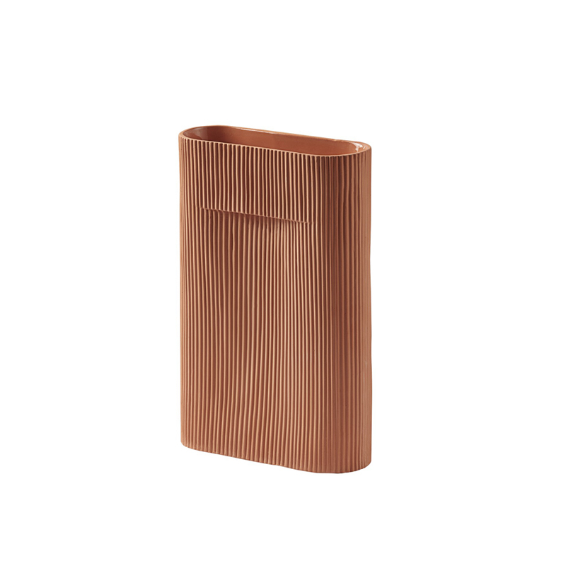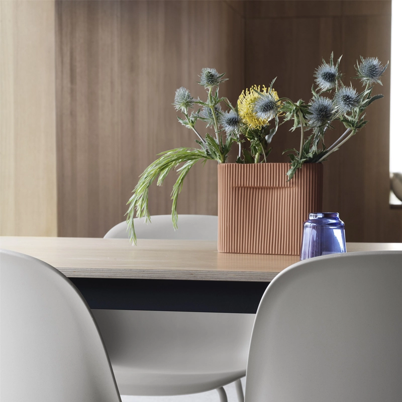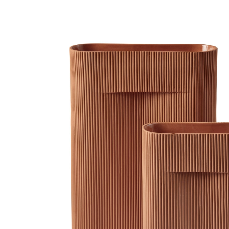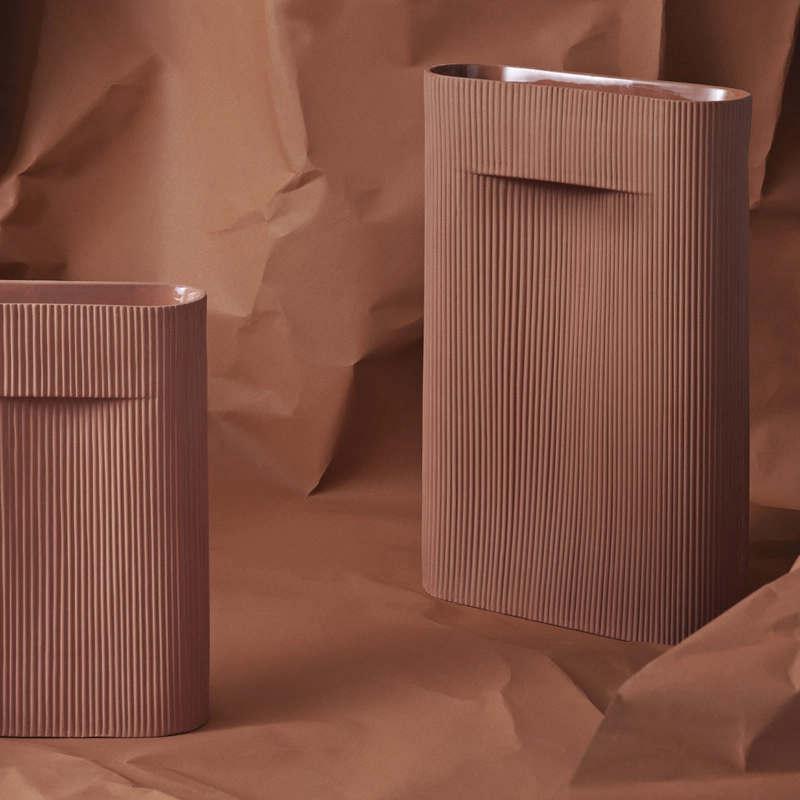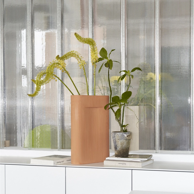 Avec ses lignes verticales et sa forme unique, le vase Ridge a été inspiré par une porte parisienne découverte par le studio Kaksikko, lors d'un voyage qui avait pour but d’inspirer la création d’un nouveau vase. Fait à la main en terre cuite, le vase Ridge représente une nouvelle façon d’exposer des fleurs grâce à son aspect sculptural et à son caractère artistique. Les lignes raffinées de Ridge lui attribuent une fonctionnalité supplémentaire, permettant de dresser les fleurs tout en facilitant la prise en main pour déplacer le vase. Les deux tailles du vase Ridge subliment aisément l’espace où ils se trouvent et apportent une touche singulière, que ce soit sur un rebord de fenêtre, au sol ou sur une table d’appoint. Objet design au caractère unique, ce vase Muuto allie la fonction à l’expression.