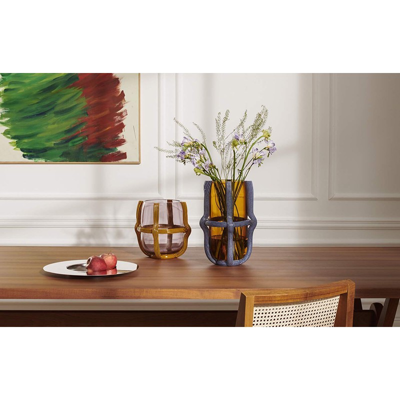 vases colorés sont conçus avec une sphère de verre soufflé presque emprisonnée dans un trellis de cordes. Ces cordes, aussi appelées "morisa", sont délicatement déposées à la main à l'extérieur du vase et sont décorées motif rayé "rigadin" typique de la tradition muranaise. Les couleurs vives de la tradition rencontrent ainsi un design à la fois épuré, précis et graphique. Les