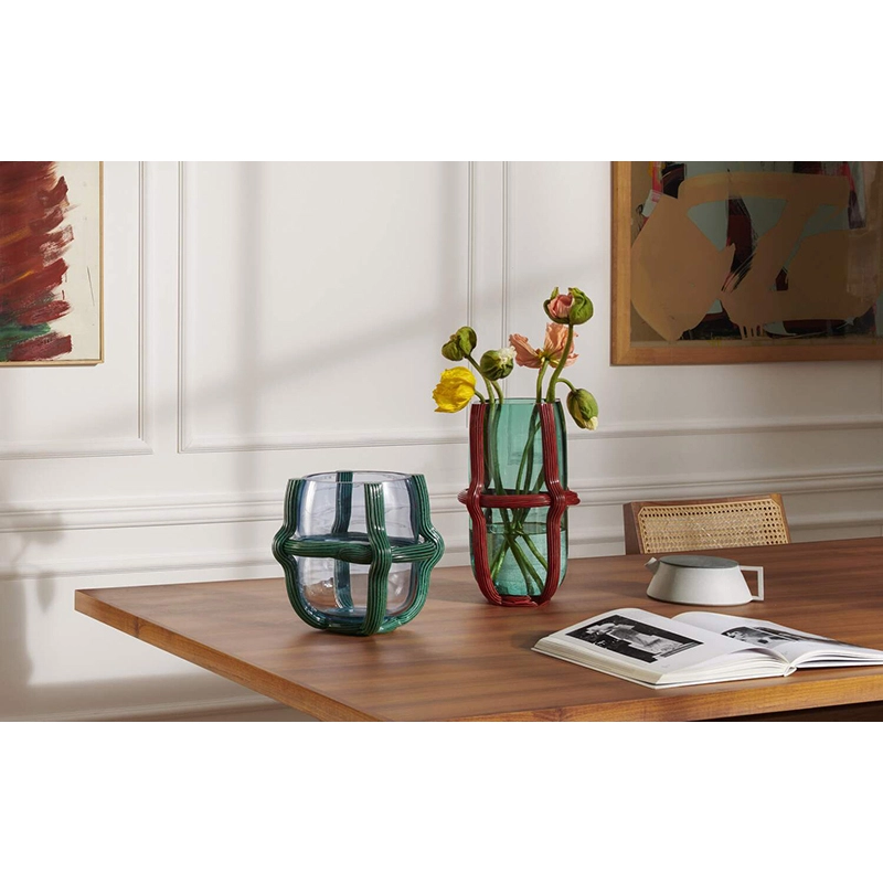 vases colorés sont conçus avec une sphère de verre soufflé presque emprisonnée dans un trellis de cordes. Ces cordes, aussi appelées "morisa", sont délicatement déposées à la main à l'extérieur du vase et sont décorées motif rayé "rigadin" typique de la tradition muranaise. Les couleurs vives de la tradition rencontrent ainsi un design à la fois épuré, précis et graphique. Les