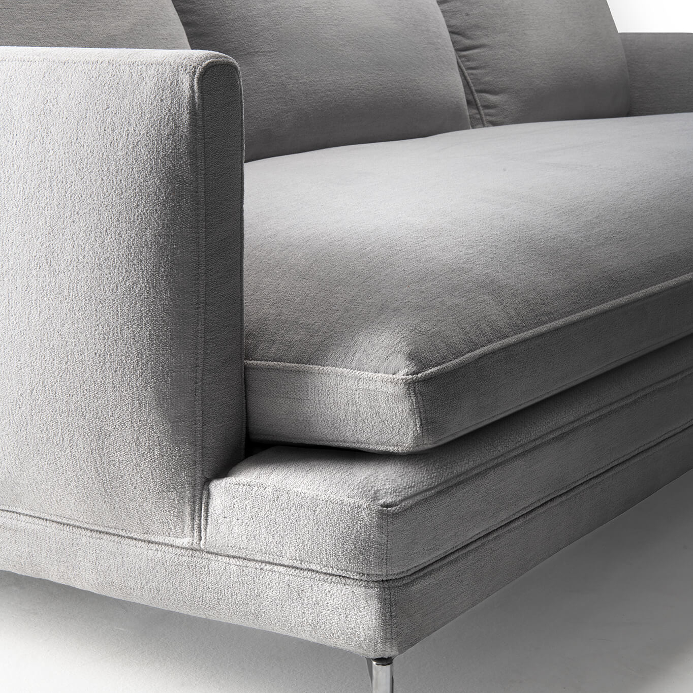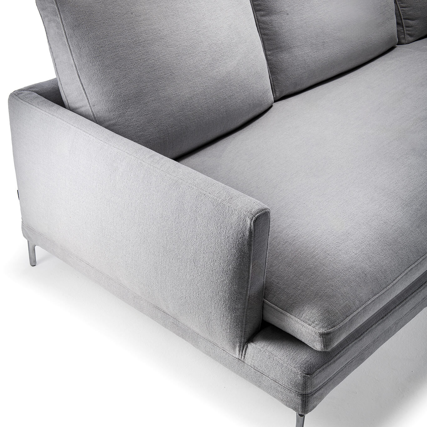 Pieds nickel satiné, revêtement tissu Tobia, rembourrage assise mousse polyuréthane à densité différenciée/fibre de polyester liée à chaud, rembourrage dossier et accoudoirs mousse polyuréthane autoextinguible/fibre polyester liée à chaud, coussinspolyester régénéré et régénérable avec insert en polyuréthane à densité différenciée