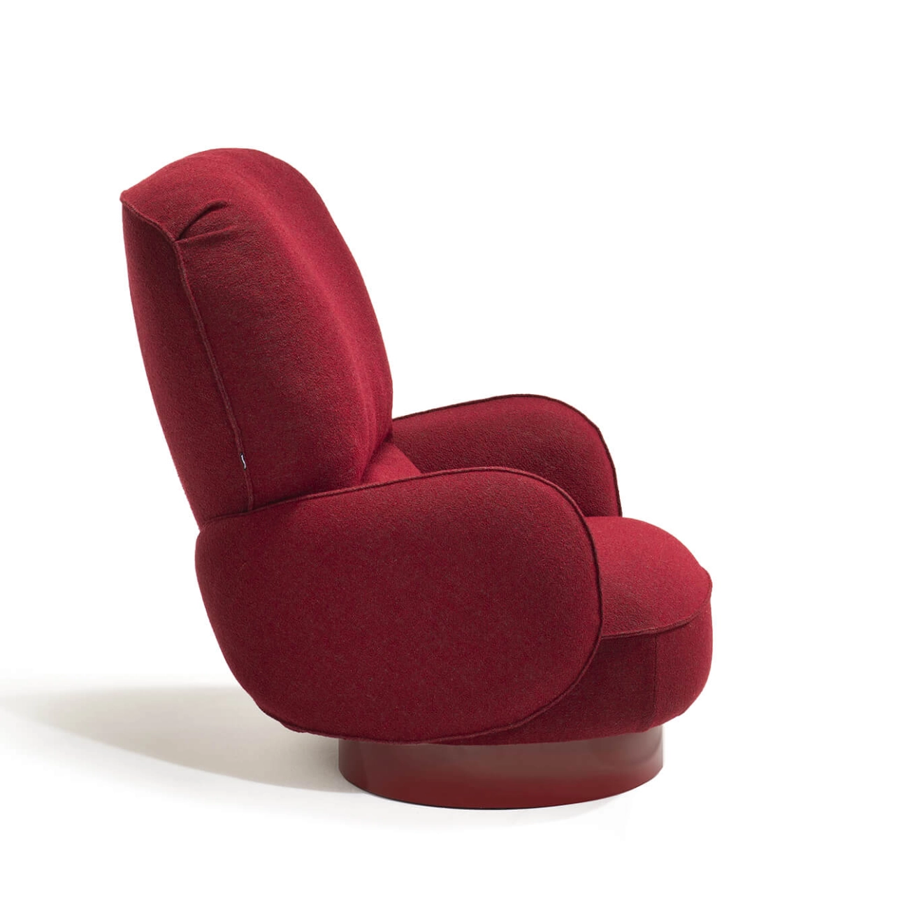 Base pivotante couleur amarante, structure acier, rembourrage mousse polyuréthane, coussin de dossier rembourrage fibres PET recyclées, revêtement amovible tissu bouclé Quantum,