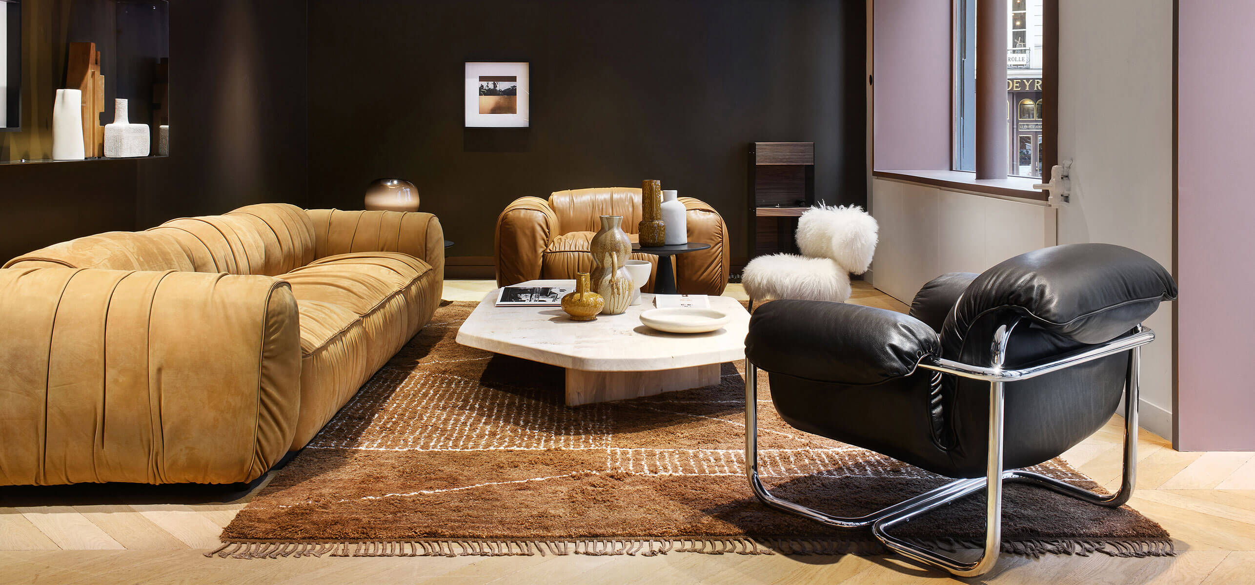 Deux étages qui servent d’écrin à des marques et designers choisis comme si vous étiez dans un appartement parisien avec des marques telles que Tacchini avec des pièces de Tobia Scarpa, David et Nicolas, Gordon Guillaumier, Studio Pepe, DeSede et le DS, Gallotti&Radice et Massimo Castagna, etc. Des luminaires de Lambert & Fils , Ingo Maurer ou Gubi et plusieurs jeunes talentueux éditeurs comme Youth Editions y sont aussi mis en avant.
